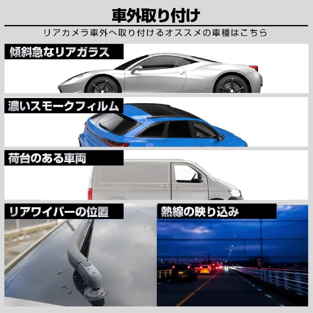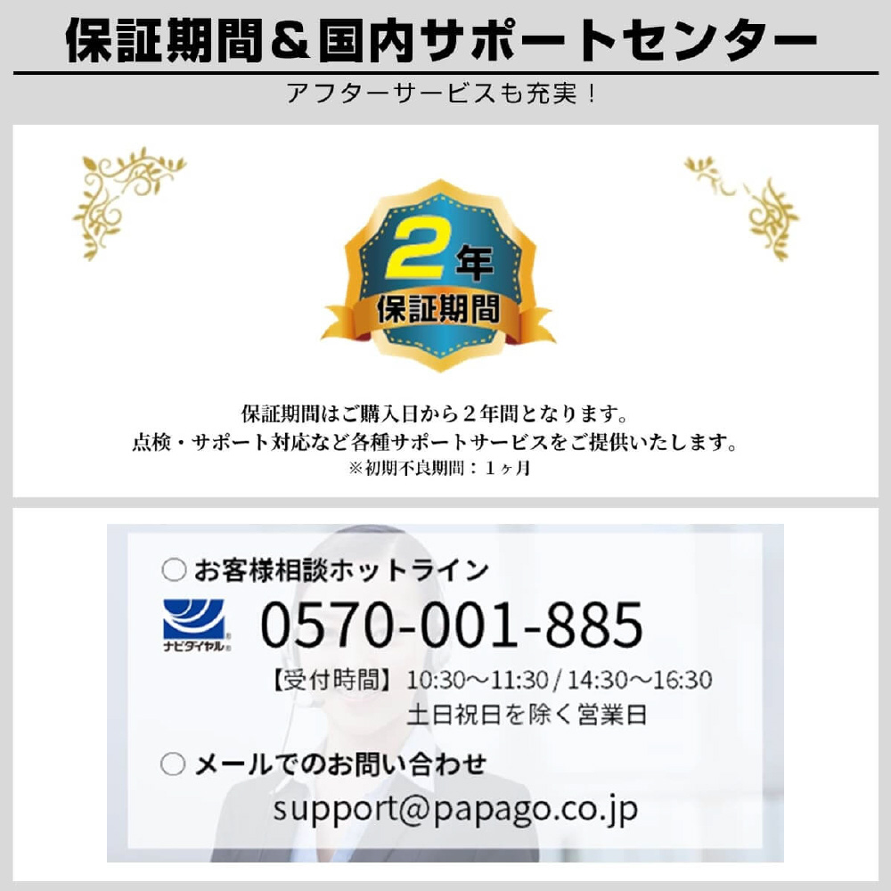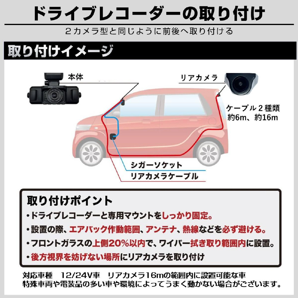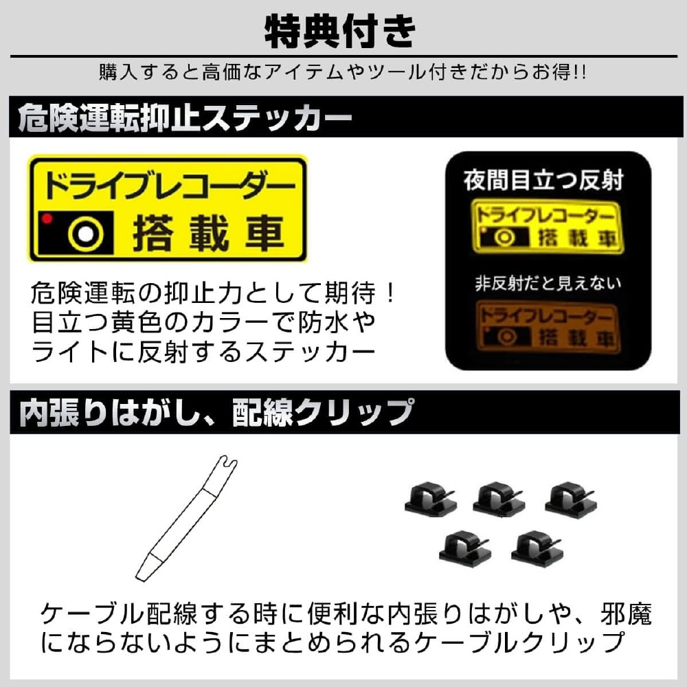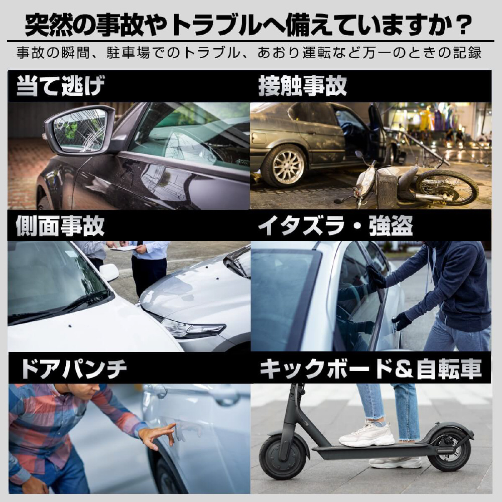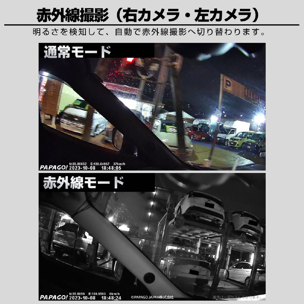 事故は前だけではない!防水リアカメラ対応の4カメラドライブレコーダー「GoSafe 640GE」は、あおり運転やわりこみ、車道を走る自転車・バイク・キックボード、側面衝突、ドアパンチなど前後左右4カメラで万が一の時を記録します。カメラ別で記録することにより、歪みの少ない鮮明な映像が録画できます。さらに、長い販売実績を持つパパゴの防水リアカメラは車内・車外どちらにも設置可能。お客様からのご要望に応え、前モデル「GoSafe 640G」をさらに進化させたモデルになります。リアカメラケーブルは6m、16mの2つの長さで、軽自動車から大型バンまで幅広い車種に対応可能です(前方2K/400万画素、左/右/後方はフルHD/200万画素)。GPS内蔵式だから見た目スッキリ!最大256GB対応(付属64GB)。左右カメラの角度変更、夜間走行時に便利な赤外線撮影、3.16インチ液晶モニター、WDR、常時/衝撃時/ボタン録画、Gセンサー、LED信号対策、地デジ対策、防犯対策機能(※要配線)など必要な機能を装備。取り付けは2カメラと同様のため、作業や工賃も手軽です。2年保証、内張り剥がし、配線クリップ、ドライブレコーダー搭載ステッカーなど特典付き。