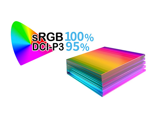 ■あらゆる角度から見ても色やコントラストの変化がおきにくいIPSパネルを搭載し、広視野角上下左右178°を実現します。最大輝度300cd/m2の液晶パネルはsRGB:100%、DCI-P3:95%の広色域に対応し動画や写真も色鮮やかに美しく表示します。