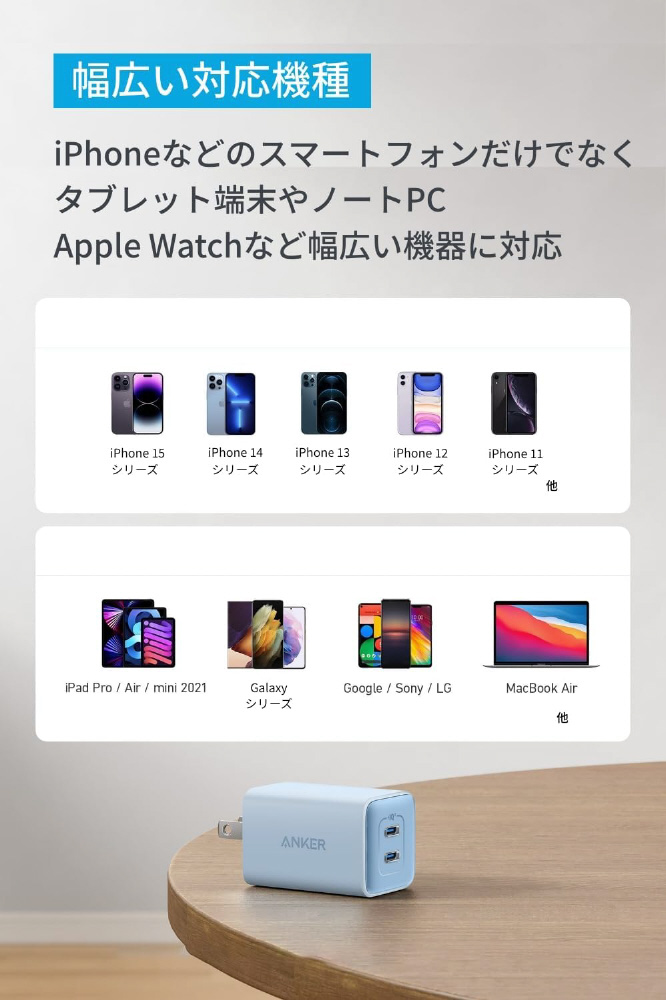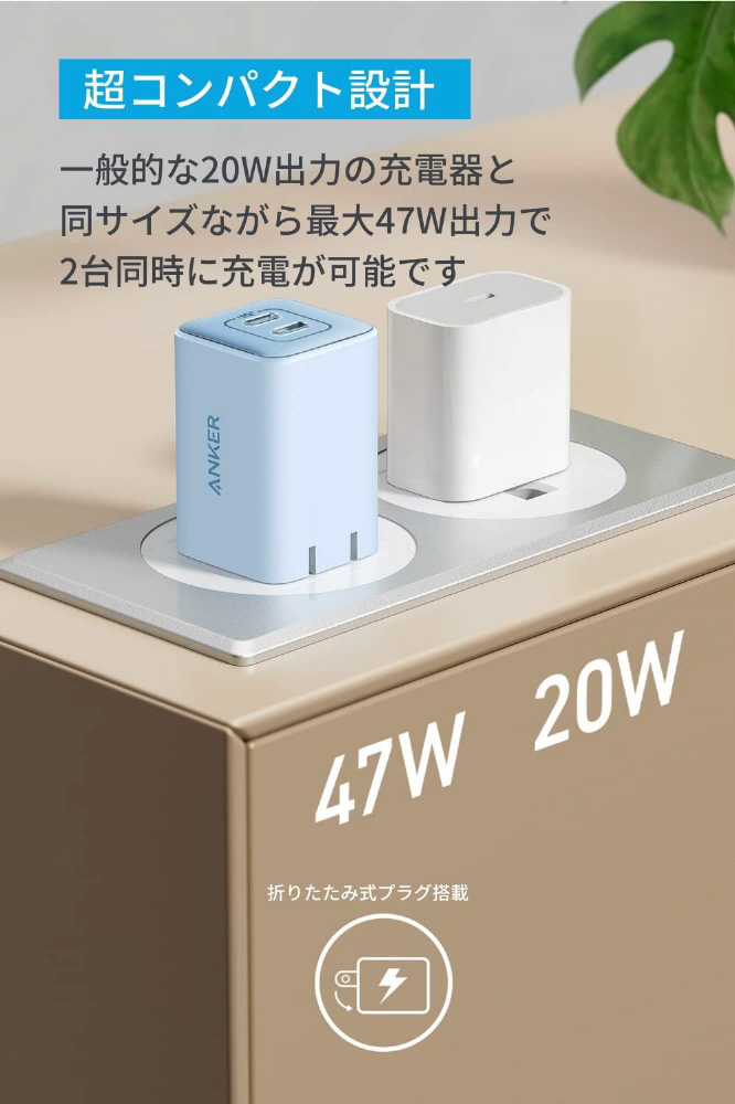 一般的な20Wの充電器と同じサイズの超コンパクト設計ながら、最大47W出力で2台同時に電が可能です (※最大47Wは2ポート同時利用時の合計出力となります。本製品以外のカラーは別売りです) 。