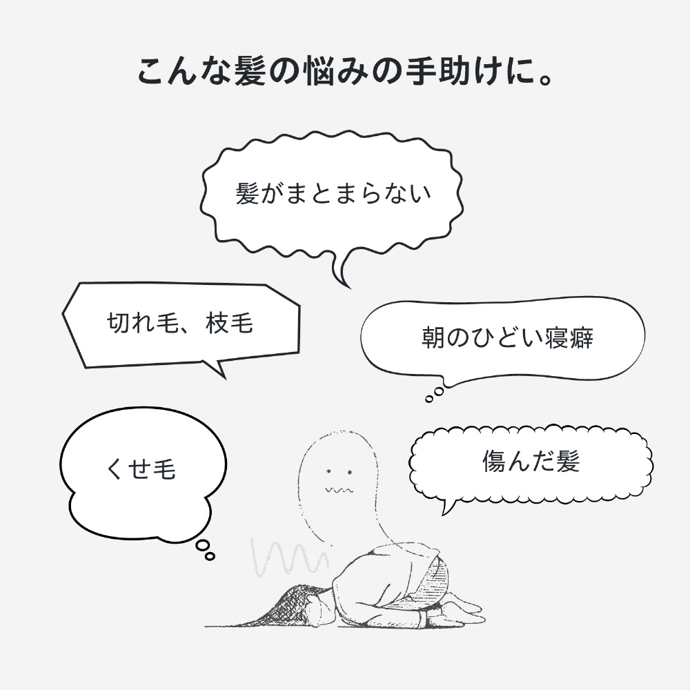 ハイダメージヘア/重ね掛けしたカラーやパーマによる髪のひどい乾燥やキシミが気になる/枝毛切れ毛に悩んでいる/寝癖が気になる/くせ毛、広がりが気になる/髪が太い、毛量が多い/ストレートパーマや縮毛矯正をあてた髪のケアをしたい/加齢に伴ううねり対策をしたい/白髪染めでのパサつきゴワつきが気になる
