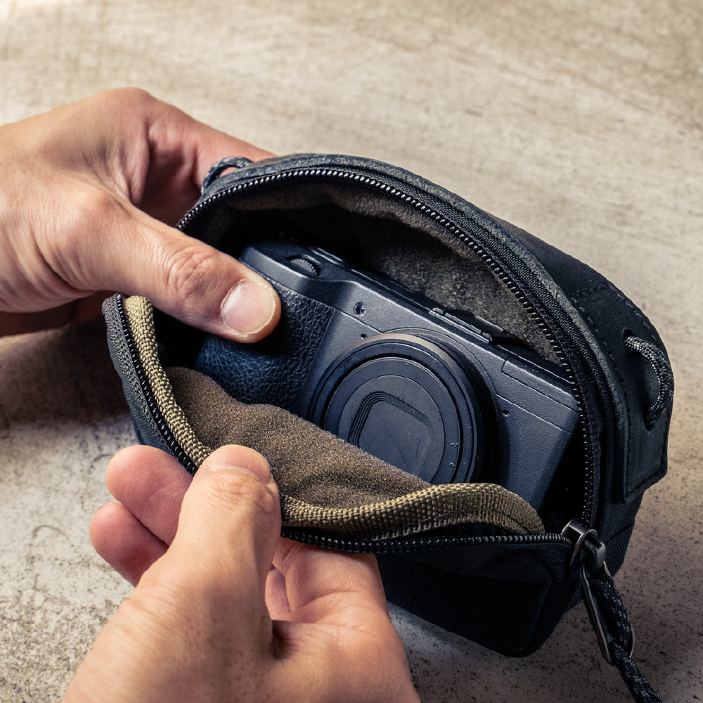 大事なものを収納するため、ポーチの保護機能は欠かせません。内側にはクッションがあり、柔らかいコットン生地を使用しています。その為カメラが傷付かず、安心して収納できます。表面にはヴォータンクラフトが独自開発した「高強度 500D ダブルコーティング撥水機能生地」を採用しており、耐久性にも優れています。