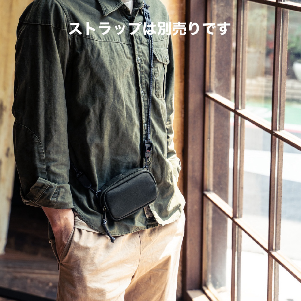 ポータブルカメラポーチにはストラップ取付用のループが2つあり、お好みのストラップを取り付けできます。別売りでヴォータンクラフトのネックストラップを取り付ければ、ポータブルカメラポーチをショルダーバッグとして使えます。