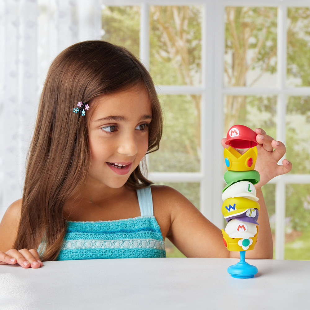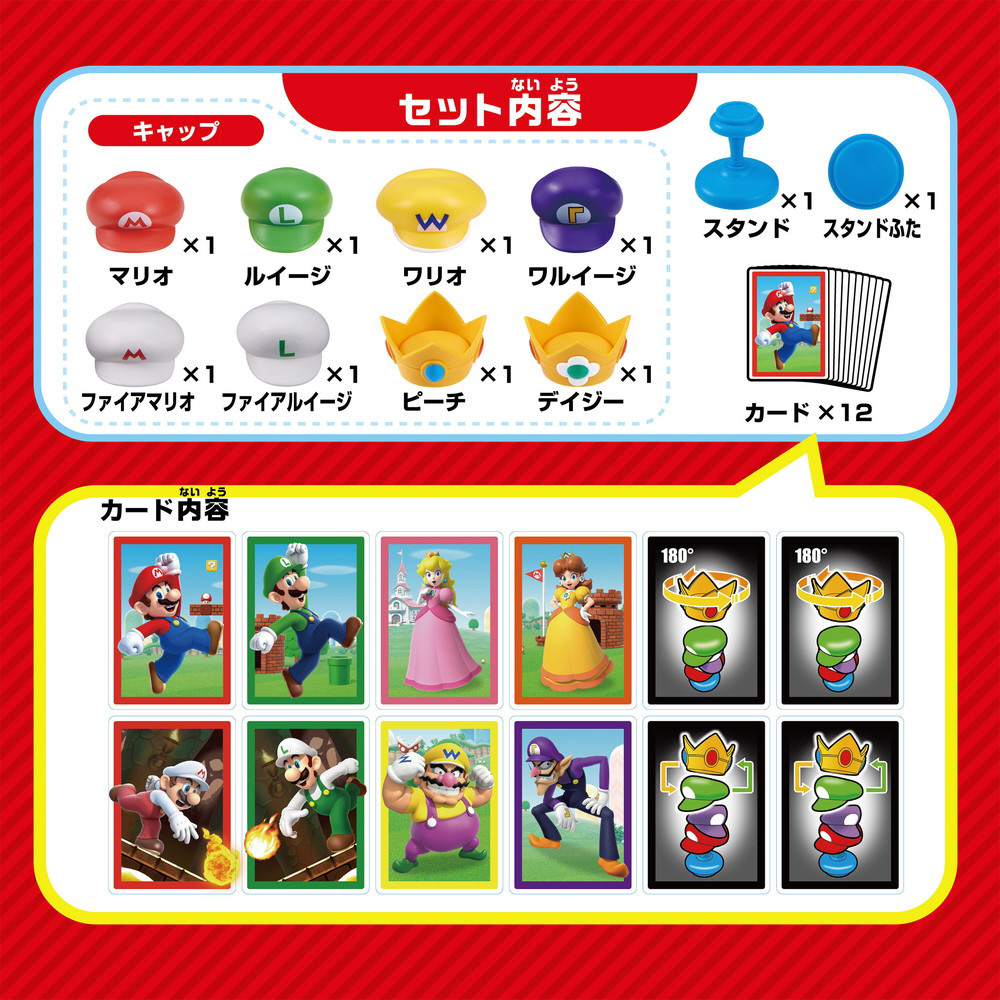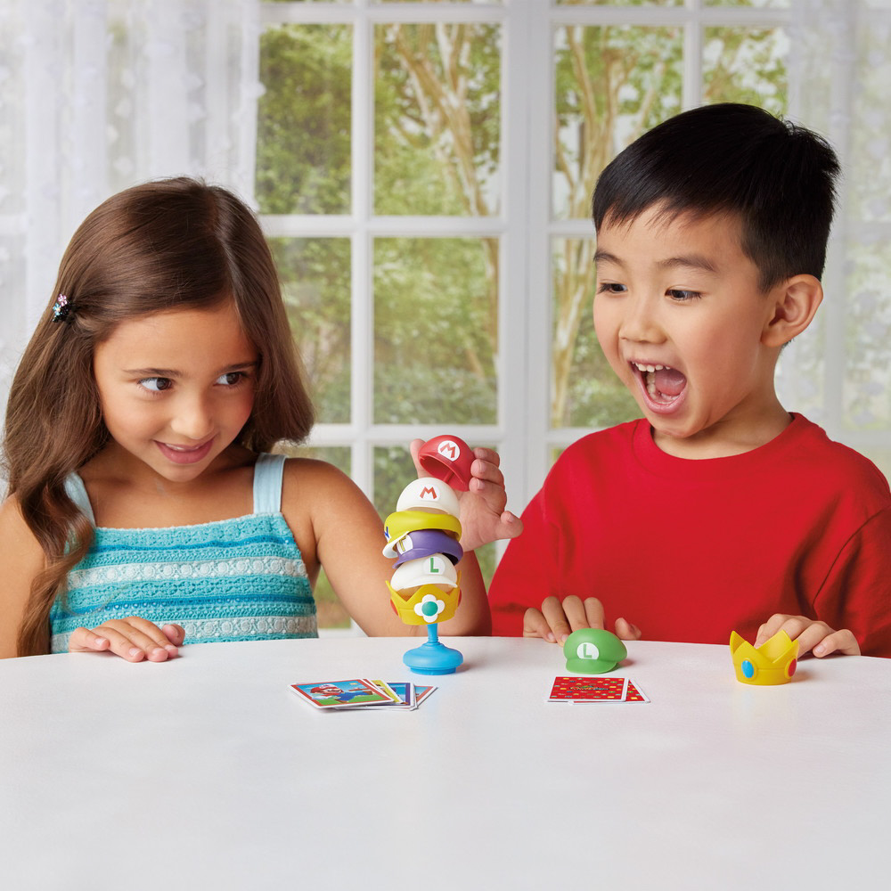 カードを引いて出てきたスーパーマリオキャラたちの帽子を積み上げよう。