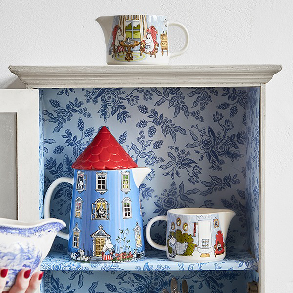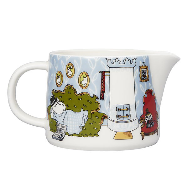 ミルクやソースにぴったりの、小さめサイズのピッチャー。ムーミンハウスの1階にある温かい居間でムーミンは読書、ムーミンママは編み物を、ムーミンパパは昼寝をしているようです。大きな椅子でのんびりとくつろいでいる、ちびのミイも描かれています。