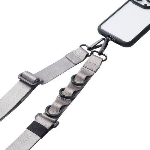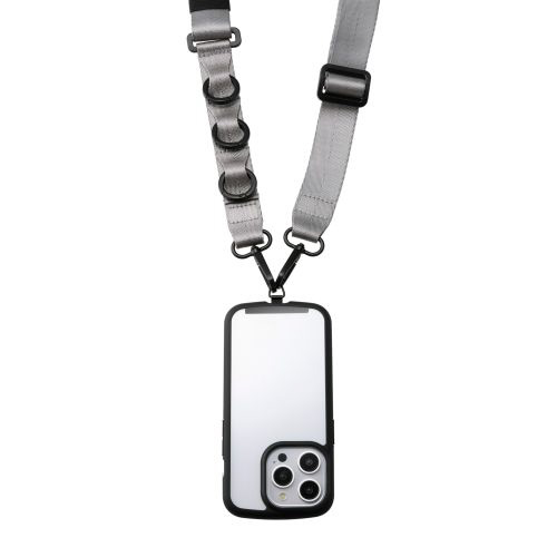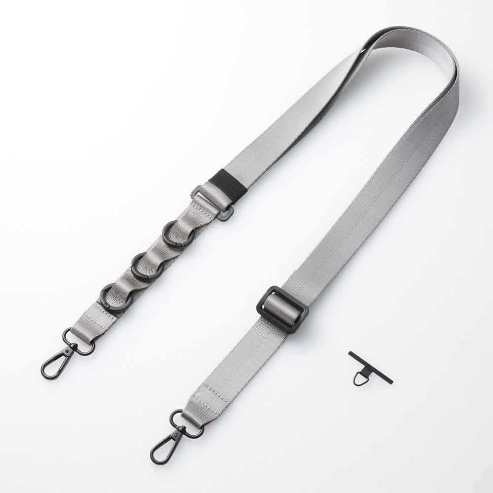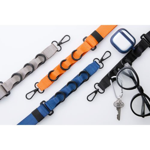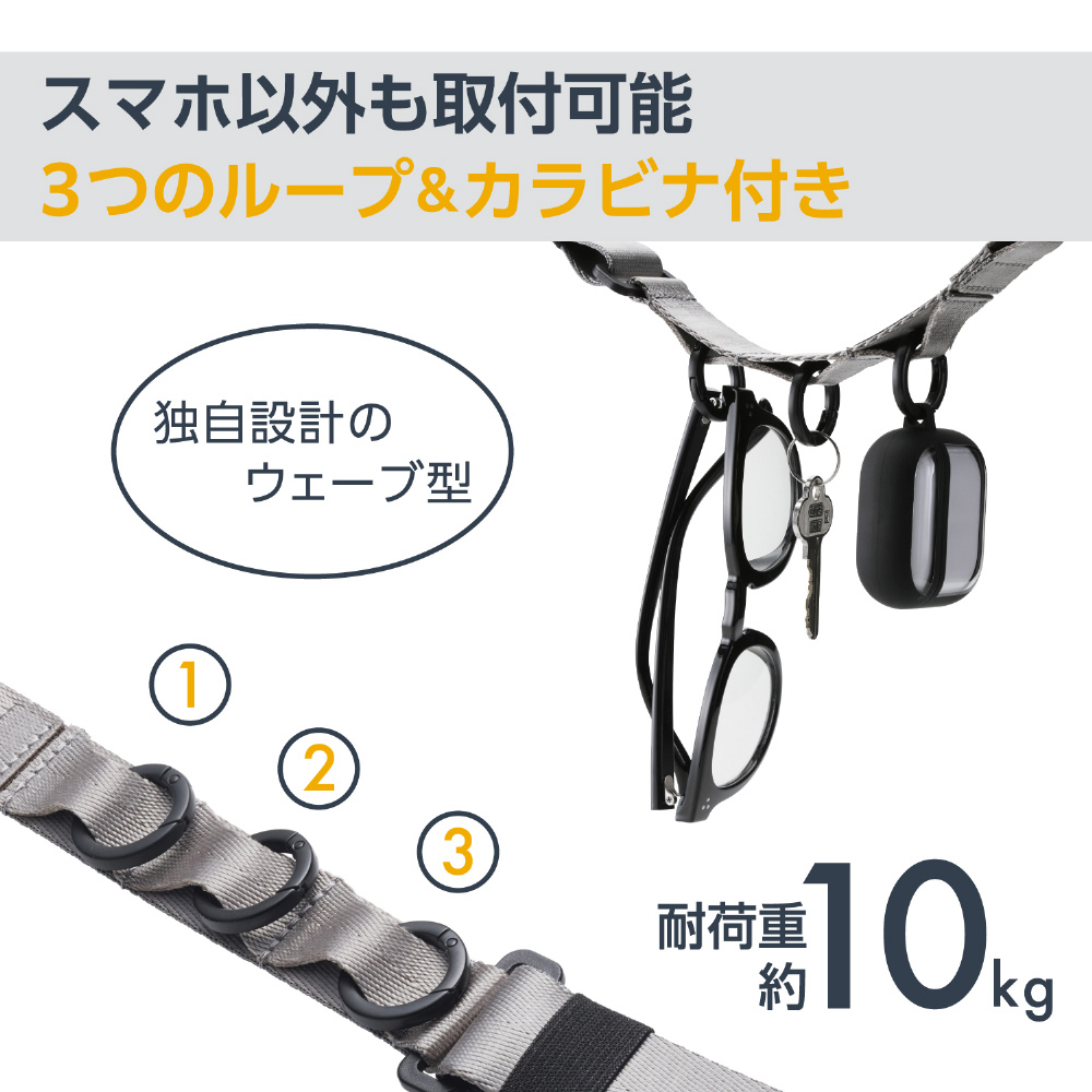 アクセサリを取り付けられる3つのループとカラビナが付いたフラットベルトタイプのスマホショルダーストラップです。両手が空いて、普段のお出かけはもちろん、お仕事や旅行などのイベント時にも活躍。落下、盗難、紛失防止にもなります。ベルト幅が30mmと太めで、ワイヤレスイヤホンや鍵などを取り付けても肩が痛くなりにくく長時間のお出かけでも使いやすいです。
