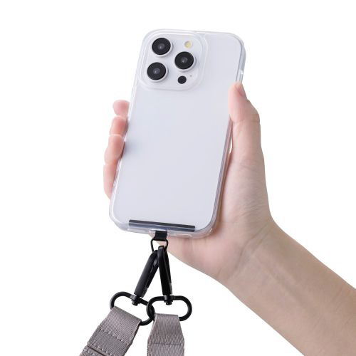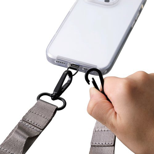 ケースにストラップホールがなくても、付属のストラップホールシートをスマートフォンとケースの間に挟むだけで使用でき、取り外しも簡単です。