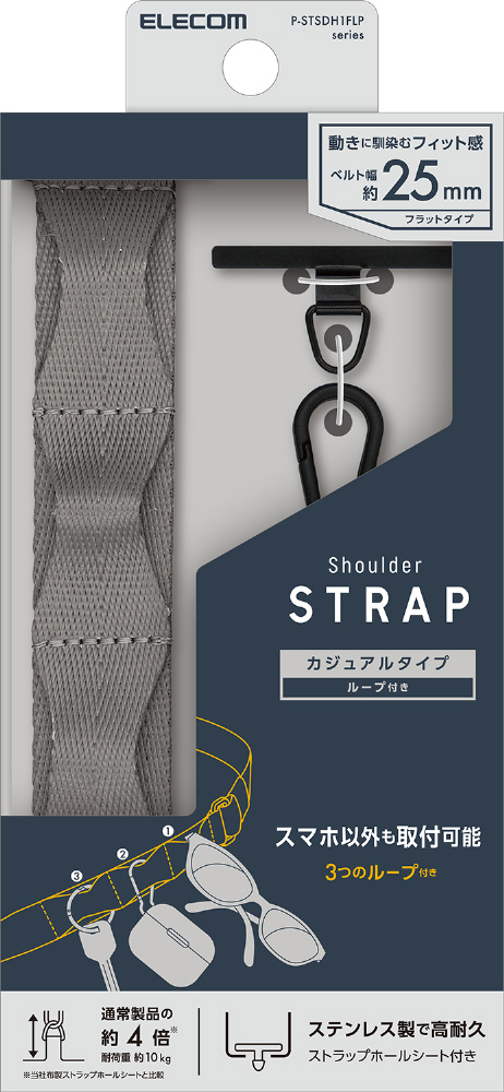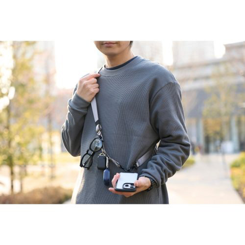 アクセサリを取り付けられる3つのループが付いたフラットベルトタイプのスマホショルダーストラップです。両手が空いて、普段のお出かけはもちろん、お仕事や旅行などのイベント時にも活躍。落下、盗難、紛失防止にもなります。ベルト幅が25mmと太めで、ワイヤレスイヤホンや鍵などを取り付けても肩が痛くなりにくく長時間のお出かけでも使いやすいです。