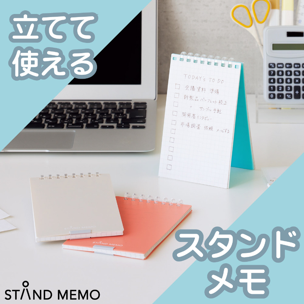 スタンドメモはタスク管理に便利な立てられるメモ。とじ具が開くのでリーフの差し替えも可能です。PC横に立ててTO DOリストとして。立てられるので場所を取りません。PC前の狭いスペースでも、横開きでコンパクトに使えます。本体は片手でも無理なく持てるサイズですが、リーフサイズは従来品より35%大きく、より多く書けるようになりました。立ったまま筆記する際にも便利です。