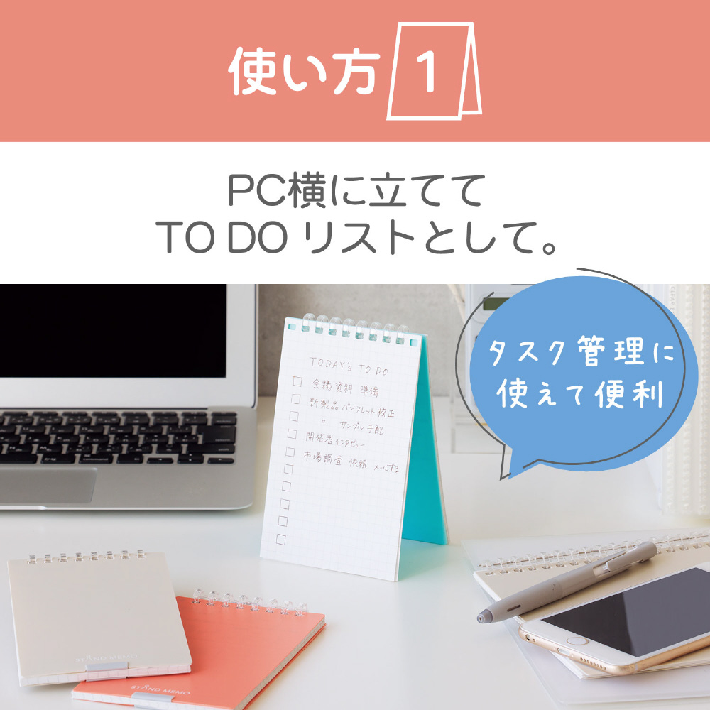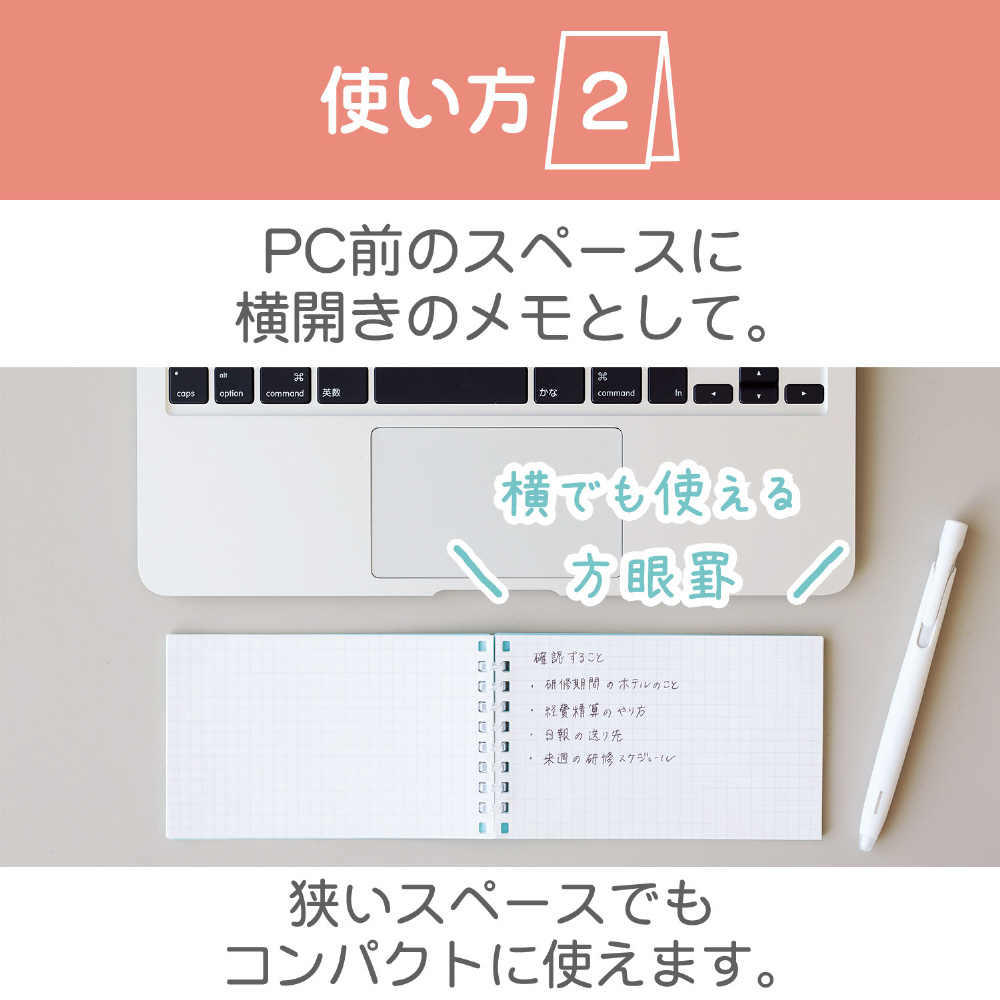 表紙についた2カ所のすべり止めで、メモを立てられます。PC横に立ててTODOリストとして使用出来ます。PC前の狭いスペースでも、横開きでコンパクトに使えます。