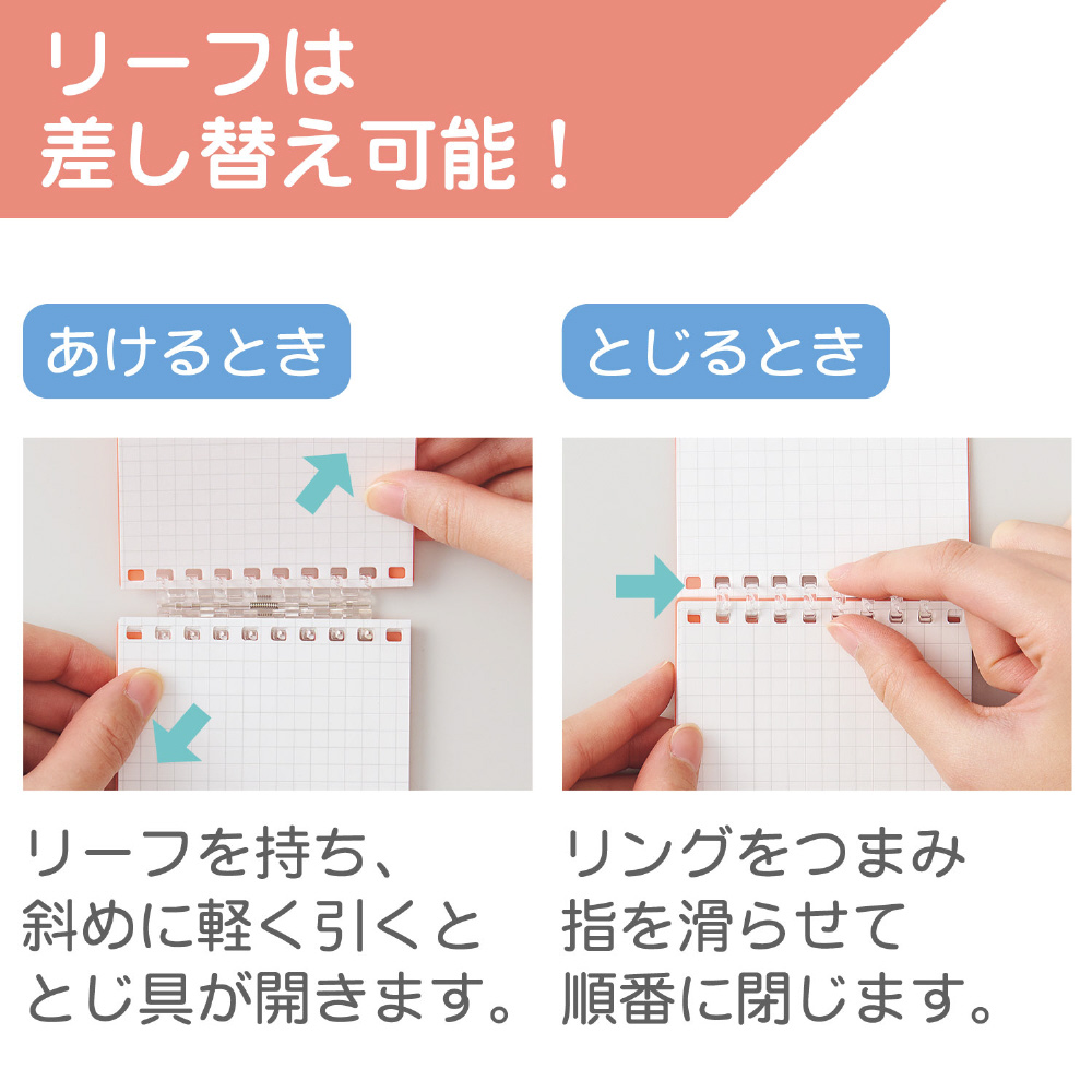 ・とじるとき:リングをつまみ指を滑らせて音がするように順番にとじると簡単です。
