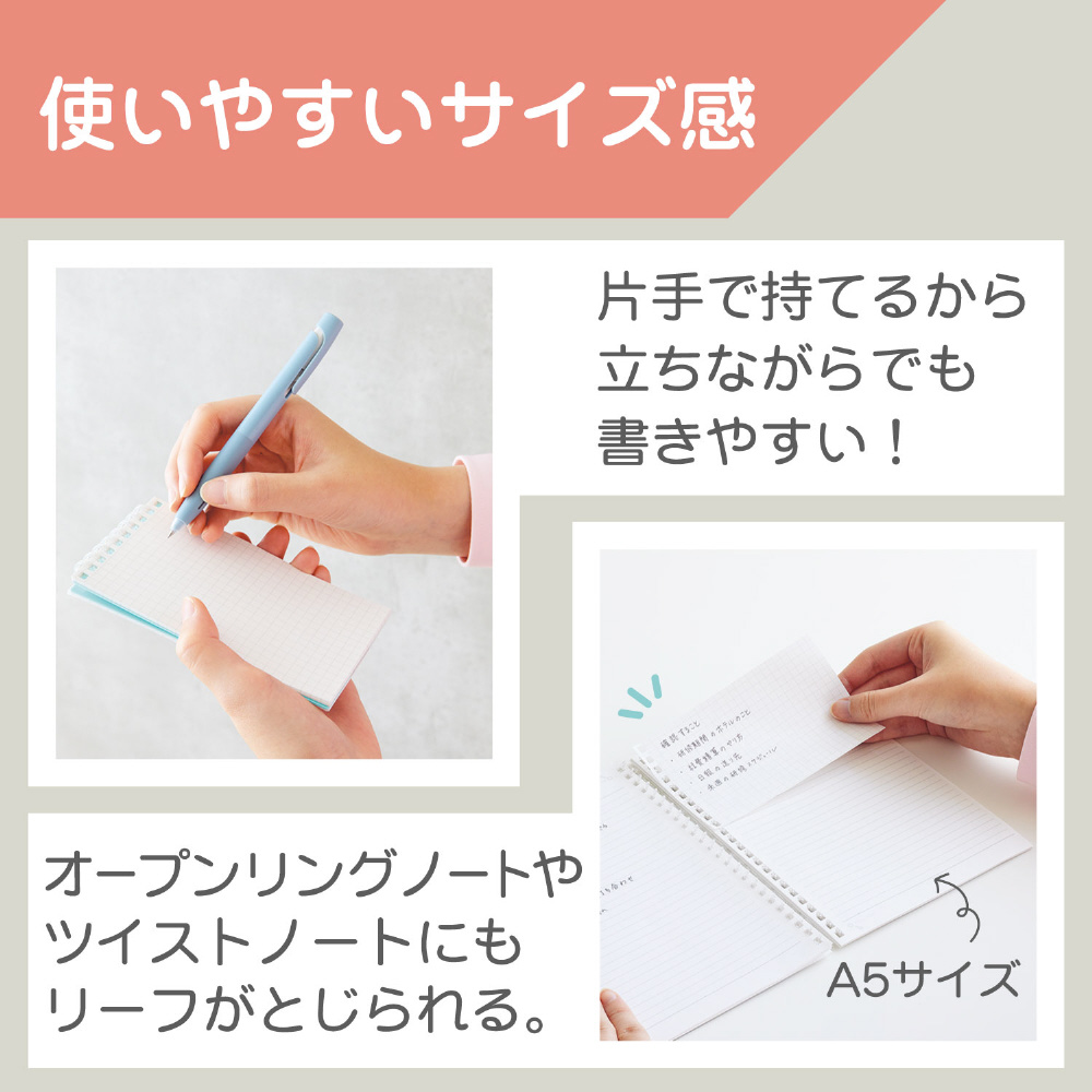 リーフのサイズを従来品(※ツイストノート(メモサイズ)(品番:N-1661))より35%大きくし、より多く書けるようになりました。また、片手で無理なく持てるサイズなので、立ったまま筆記する際にも便利です。