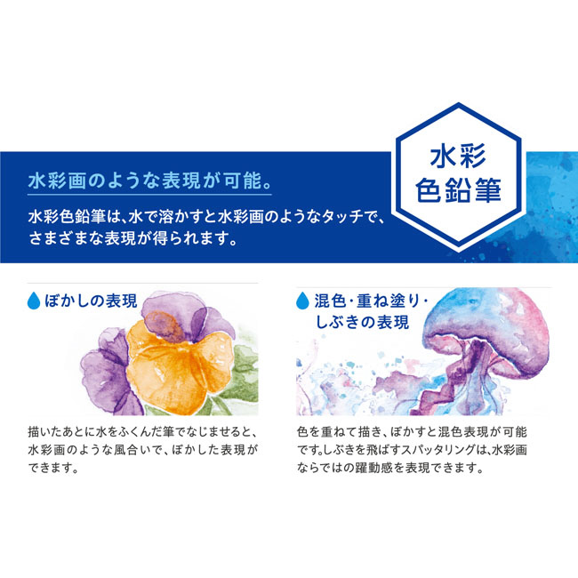 Artline 水彩色鉛筆は、水で溶かすと水彩画のようなタッチで様々な表現が得られる水彩色鉛筆。ぼかしや混色・重ね塗り、しぶきの表現など、水彩画のような表現が楽しめます。