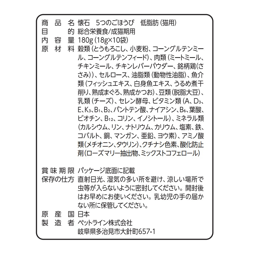 ・カロリー約10%、脂質約10%カット*で、肥満傾向の愛猫に配慮。*懐石5つのごほうび深紅比