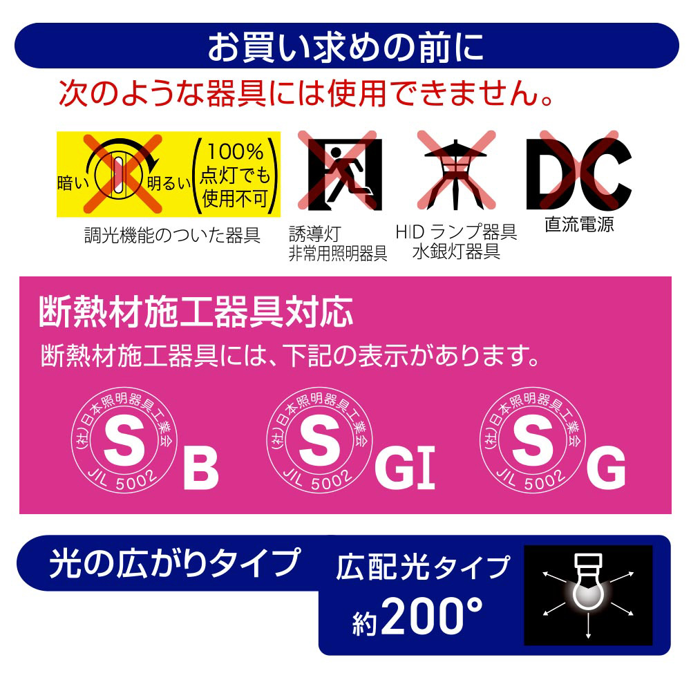 ※ご使用になられる照明器具の構造によっては、放熱不良で短寿命となることがあります。