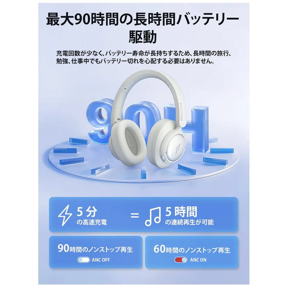 バッテリー性能も抜群で、ANCオフ時は最大100時間、ANCオン時でも最大65時間の連続再生が可能。