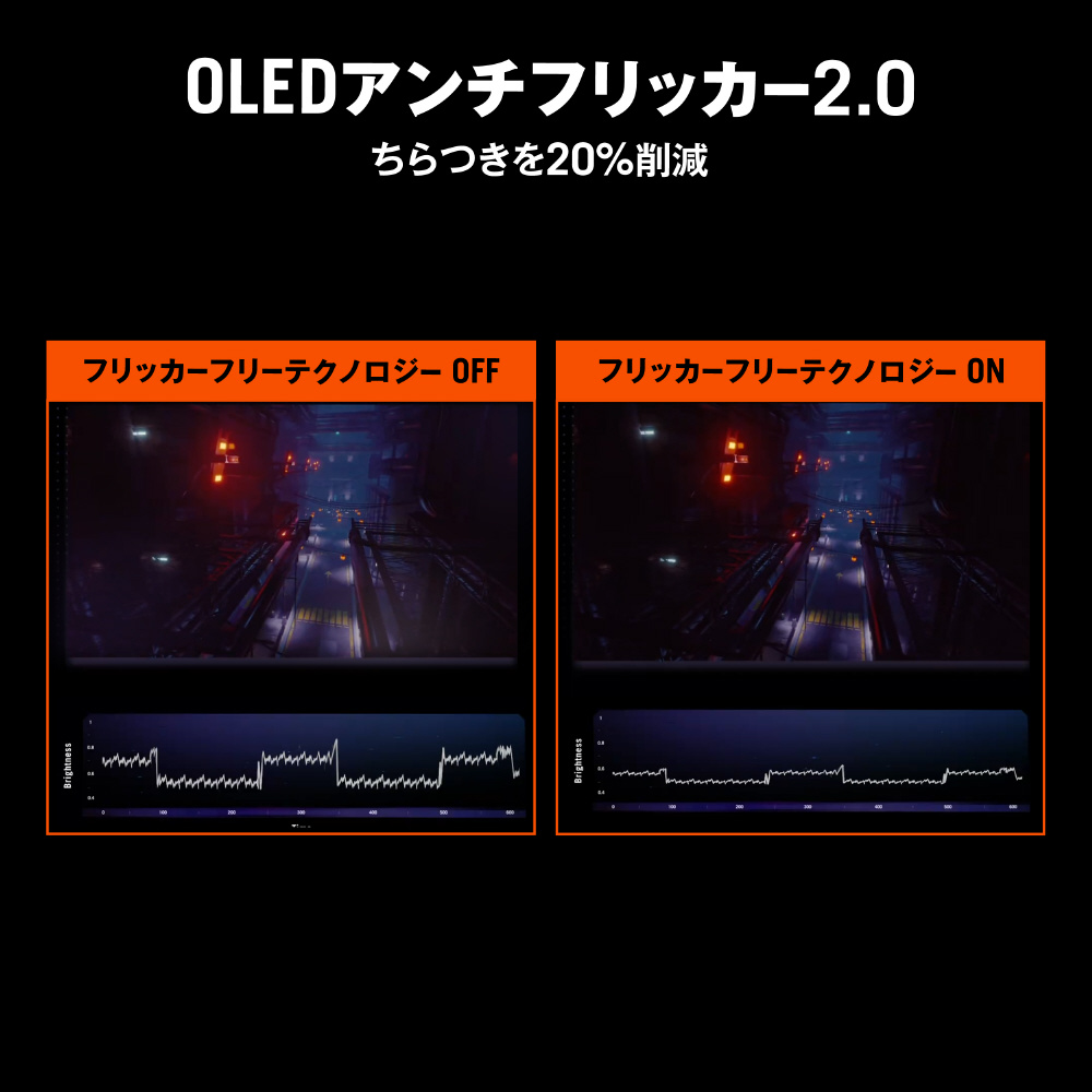新しいROG OLEDアンチフリッカー2.0テクノロジーにより、前世代のパネルと比較して画面のちらつきを最大20%削減し、快適なゲームを楽しむことができます。