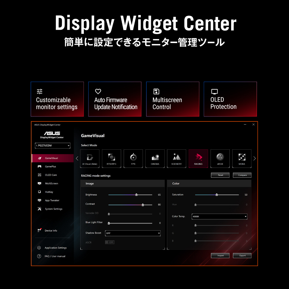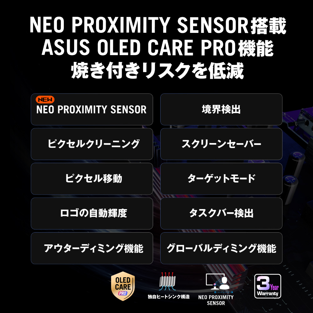 新しいASUS OLED Care Proテクノロジーは、モニターの設定をカスタマイズし、有機ELパネルを保護して画面の寿命を延ばしましょう。さらに、新しいNeo Proximity Sensorは、モニターから離れたことを検出すると、黒い画像に切り替わり、パネルを焼き付きから保護します。すべての設定は、DisplayWidget Centerで簡単に管理できます。