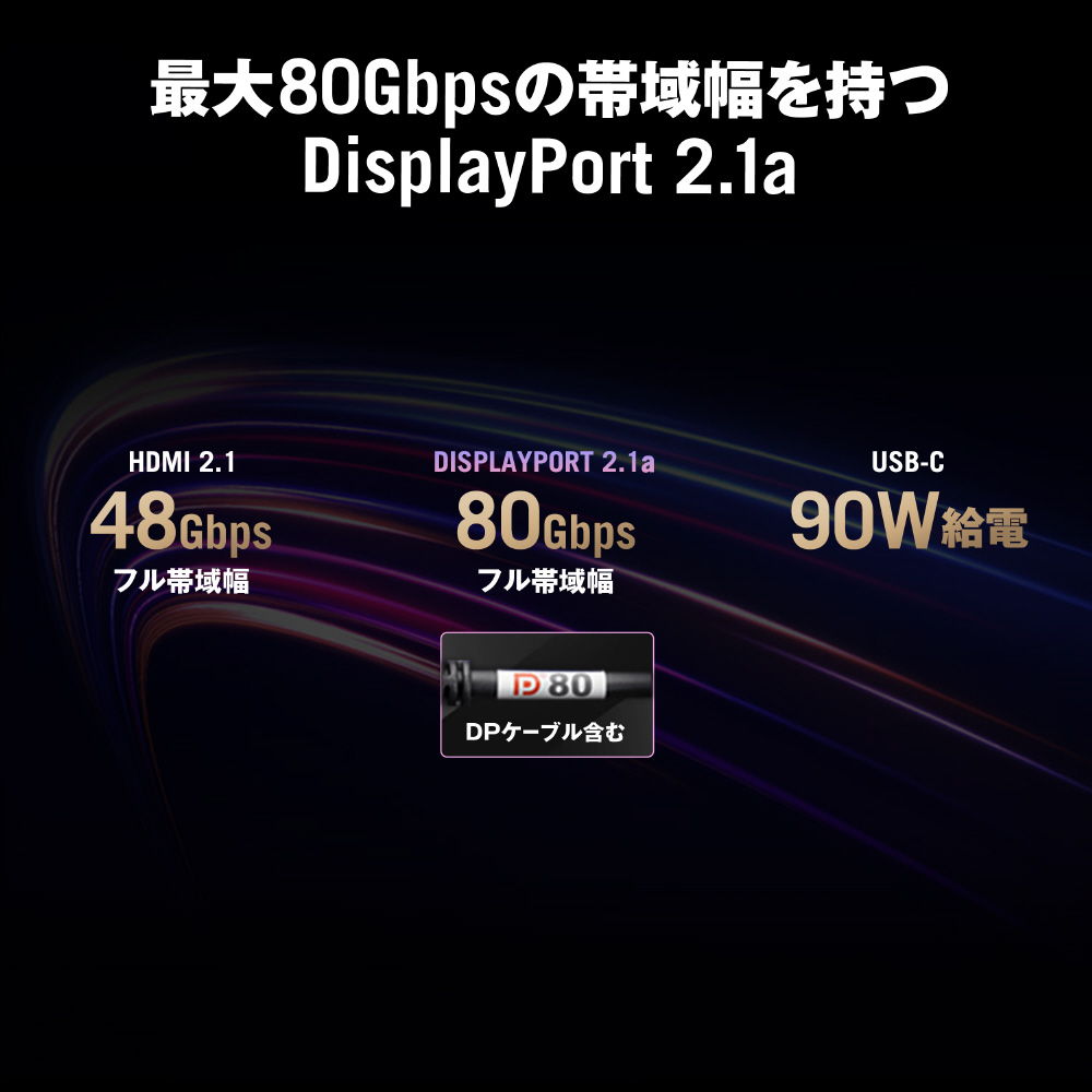 PG27UCDMは、最大80Gbpsの帯域幅を持つ未来対応のDisplayPort 2.1a UHBR20を搭載し、圧縮なし4Kで240Hz、または8Kで60Hzのビジュアルをサポートしながら、データ伝送効率を向上させます。さらに、90ワット給電に対応したUSB-C、HDMI 2.1ポート、USBハブなど、多様なマルチメディア機器をサポートします。