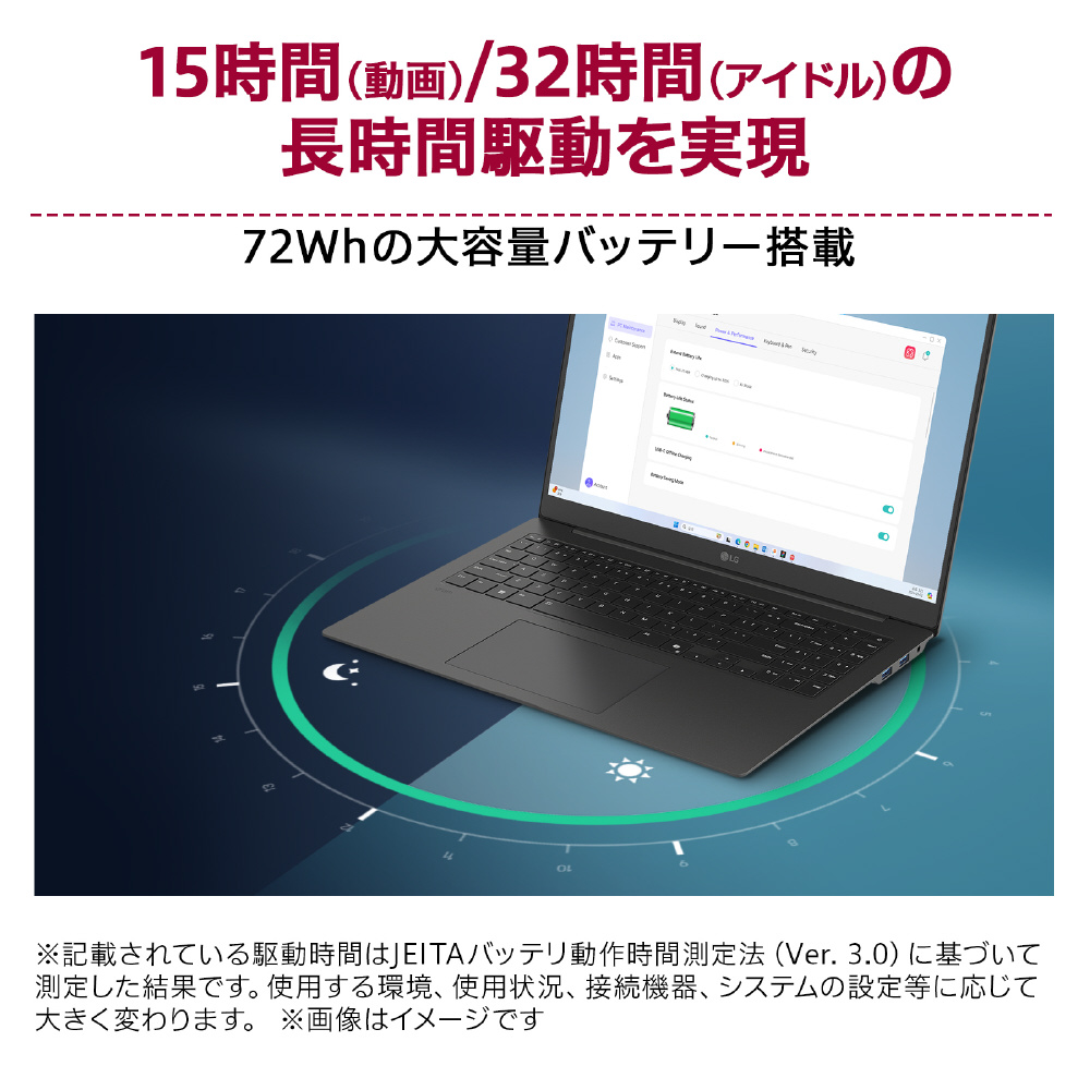 * 記載されている駆動時間はJEITAバッテリ動作時間測定法(Ver. 3.0)に基づいて測定した結果です。使用する環境、使用状況、接続機器、システムの設定等に応じて大きく変わります。