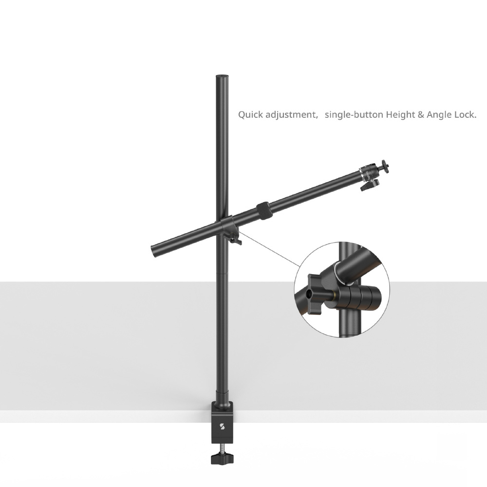 カメラ、ライト、マイク、その他の機器を収容できるように設計されており、屋内でのライブ ストリーミング、デスクトップ写真、ビデオ会議、その他のデスクトップ撮影が必要なシナリオに適しています。スタンドのモジュラー メタル ノブにより、ワンタッチで高さと角度を調整できます。