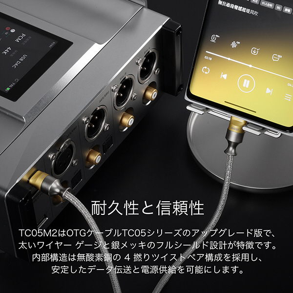 TC05M2はOTGケーブルTC05シリーズのアップグレード版です。太いワイヤーゲージと銀メッキのフルシールド設計が特徴です。内部構造は無酸素銅の4撚りツイストペア構成を採用し、安定したデータ転送と電源供給を可能にします。