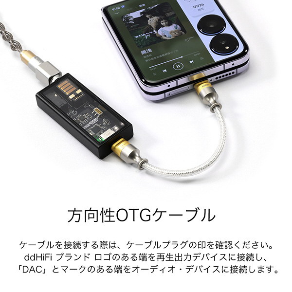 ケーブルを接続する際はケーブルプラグの印をご確認ください。ddHiFiブランドロゴのある端を再生出力デバイスに接続し、「DAC」とマークがある端をオーディオ・デバイスに接続して下さい。