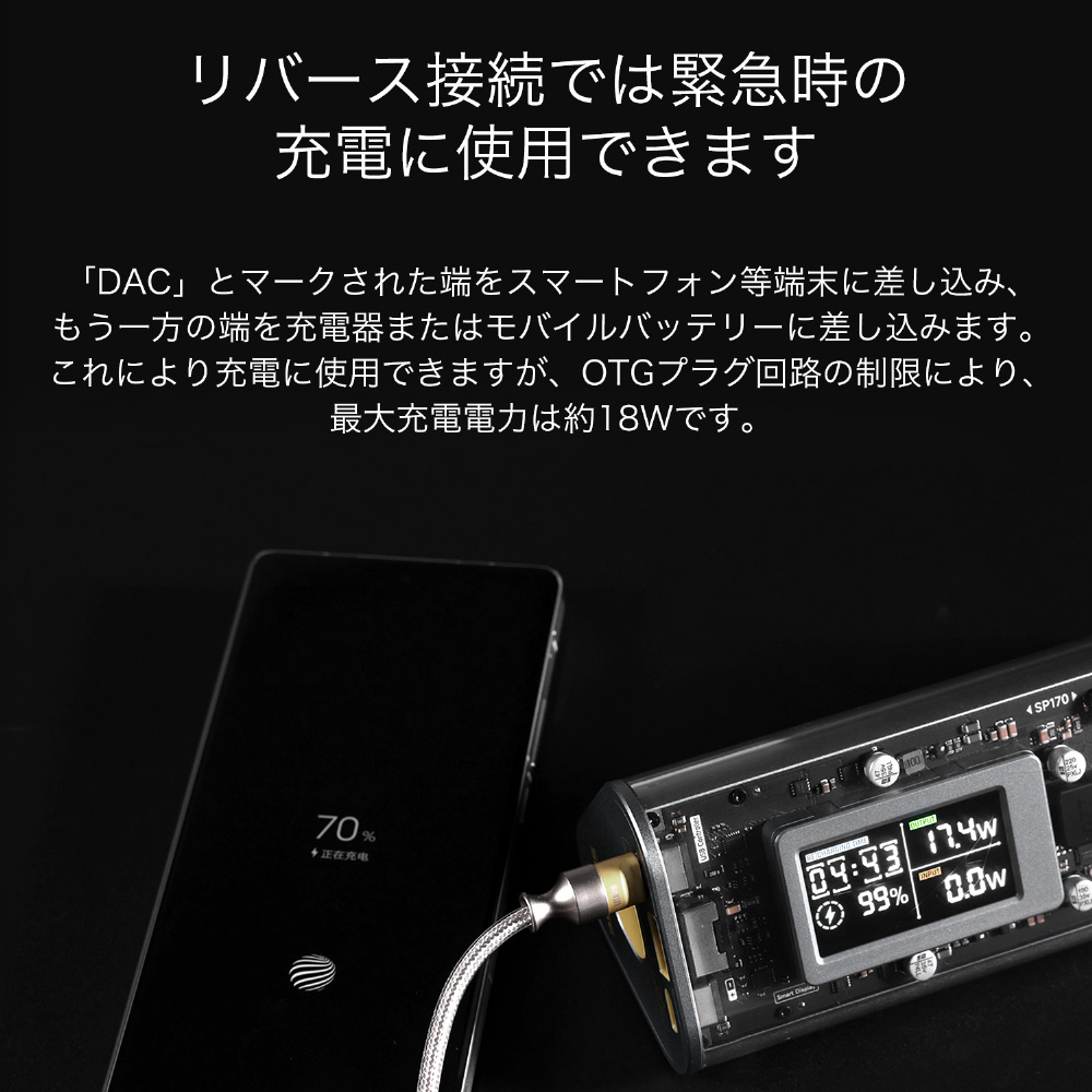 「DAC」とマークされた方をスマートフォンなどの端末に差し込み、もう一方を充電器またはモバイルバッテリーに差し込みます。これにより充電ケーブルとして使用できます。ただしOTG回路の制限により最大充電電力は約18Wです。