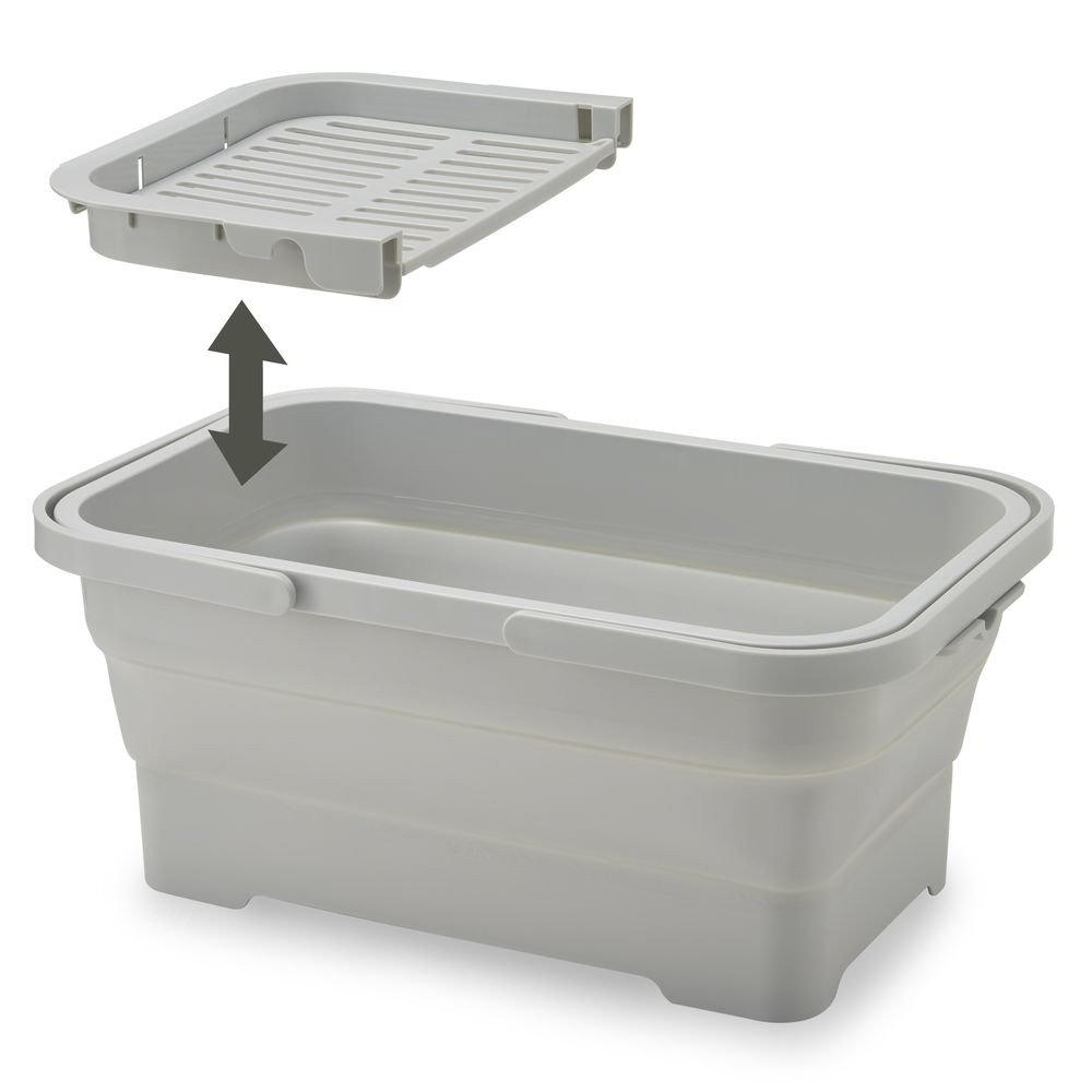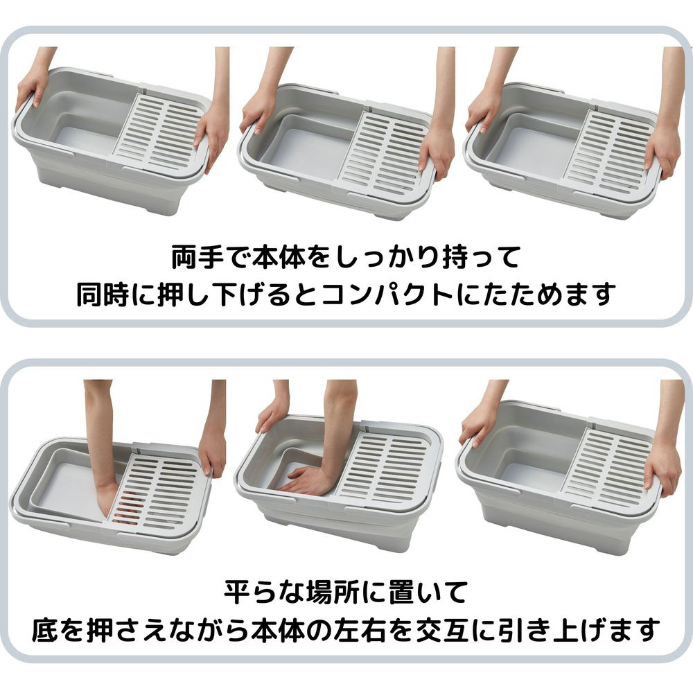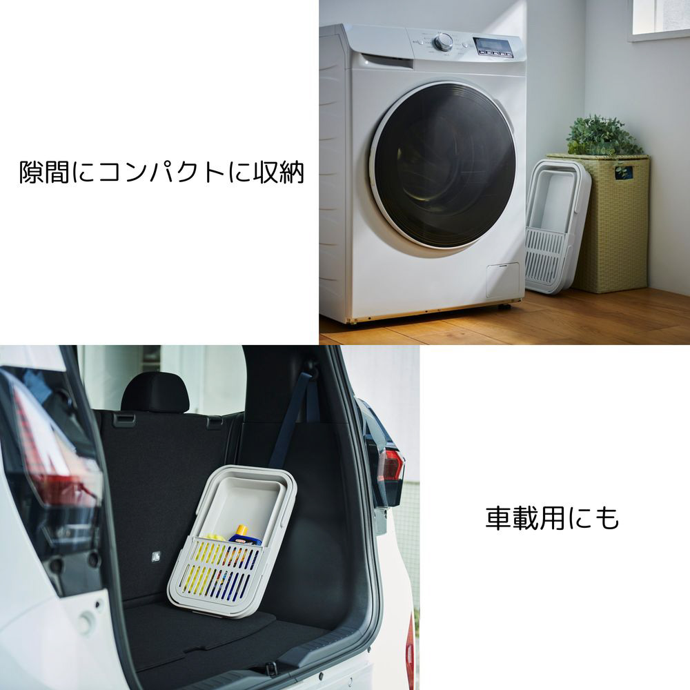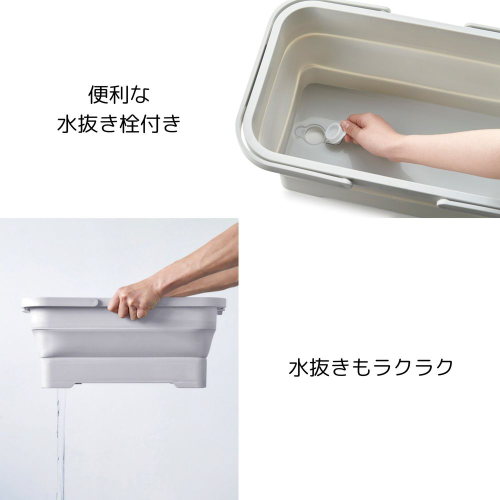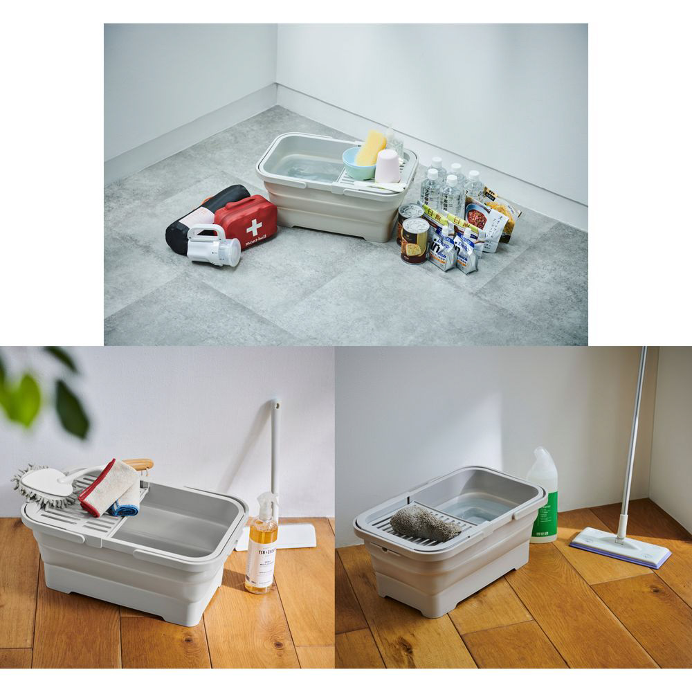 たたんでコンパクトに収納できるバスケットです。トレーは取り外しOK。清掃用品など小物のちょい置きに便利です。ヒモを掛けられるので吊り下げ収納ができ、その状態でお掃除道具の収納が可能です。便利な水抜き栓もついています。洗剤のちょい置き、清掃用品、緊急時の食器洗い、上履きの浸け置き洗い、車の洗車など使い道は様々です。【仕様】付属品:ちょい置きトレー●折りたたみ時サイズ:奥行28.6×幅46.3×高さ7.3cm●容量:15000ml