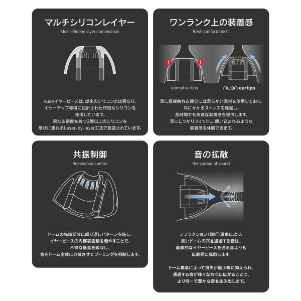 nuon clearは迅速な応答性とクールな高域表現にフォーカスしてチューニングされたイヤーピースです。空間音響強化技術によってボーカルと楽器の音の定位感が向上しました。広い空間表現とセンターに位置するボーカル、レスポンスの良い応答性によってすっきりとした明瞭な音を提供します。様々な音の位置に変化をつけ、自分だけのコンサート会場を演出しましょう。