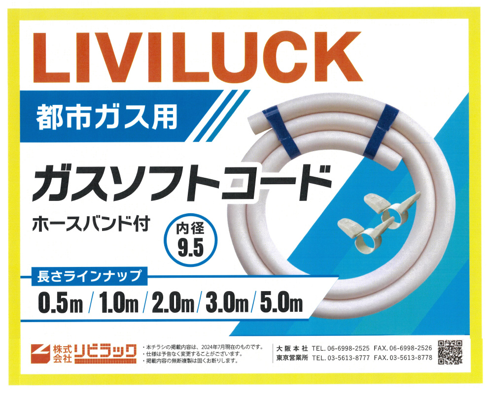 都市ガス用ガスソフトコード ホースバンド付き φ9.5×1.0M