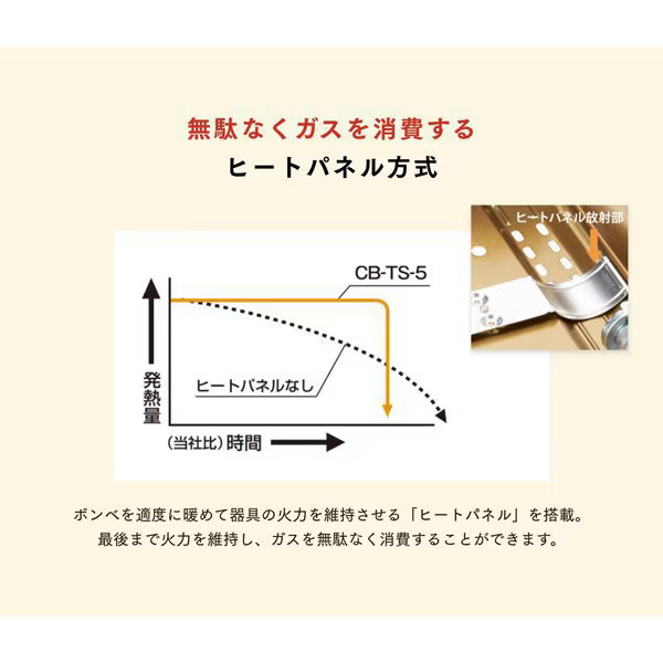ヒートパネル搭載で火力を落とさず、ガスを無駄なく使い切れます。