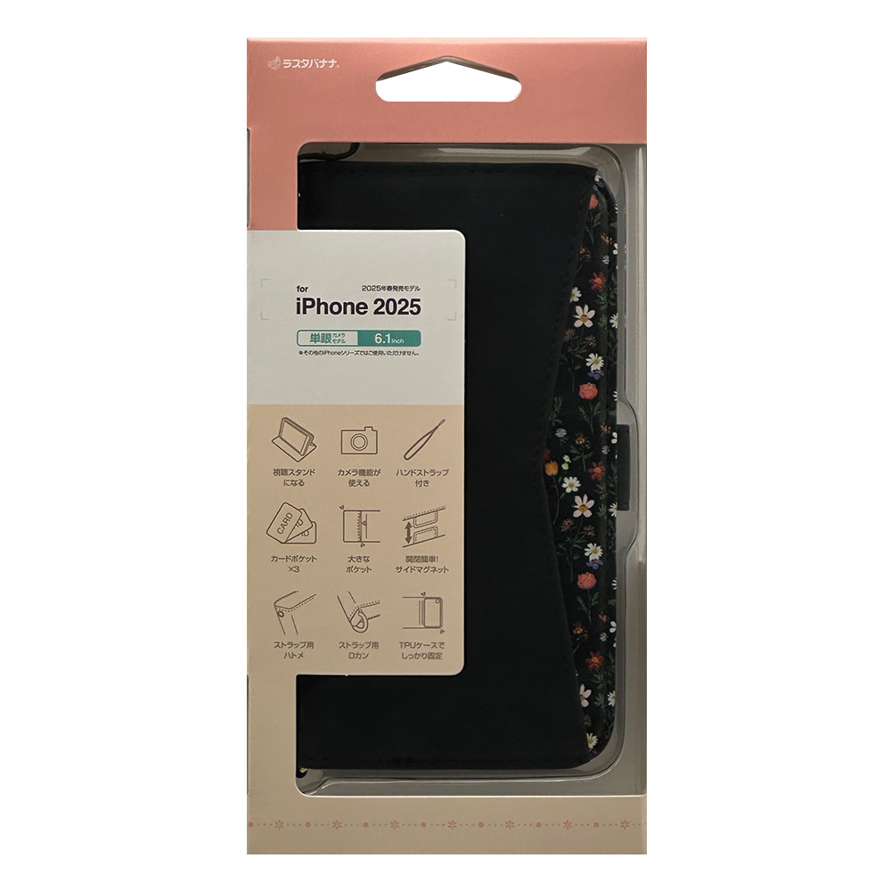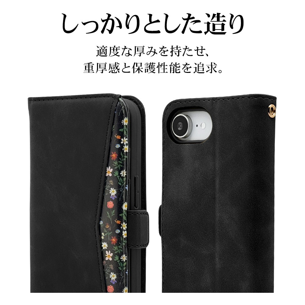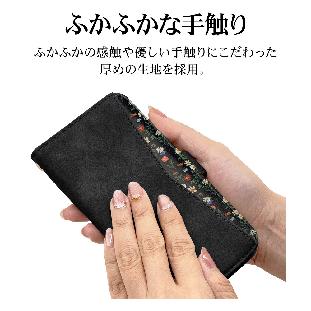 本製品は液晶画面側と背面側の両面を保護できるハンドストラップ付きの花柄手帳型ケースです。