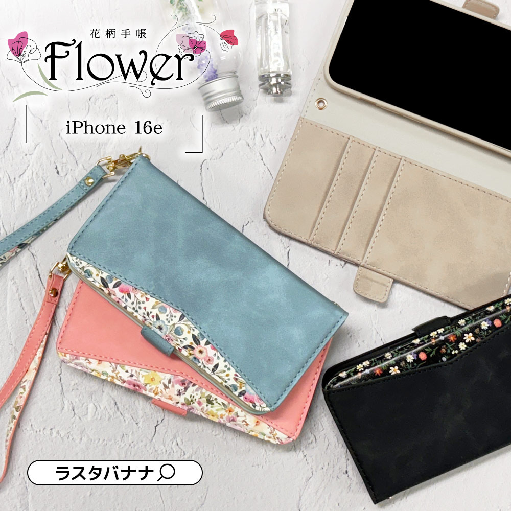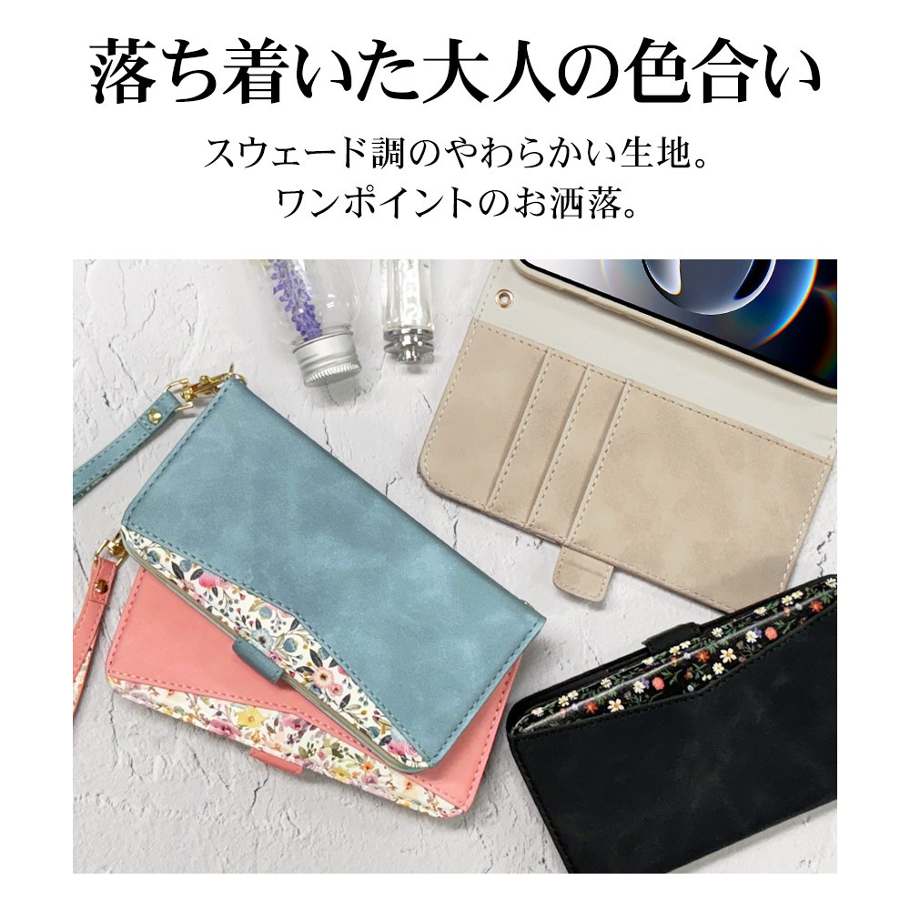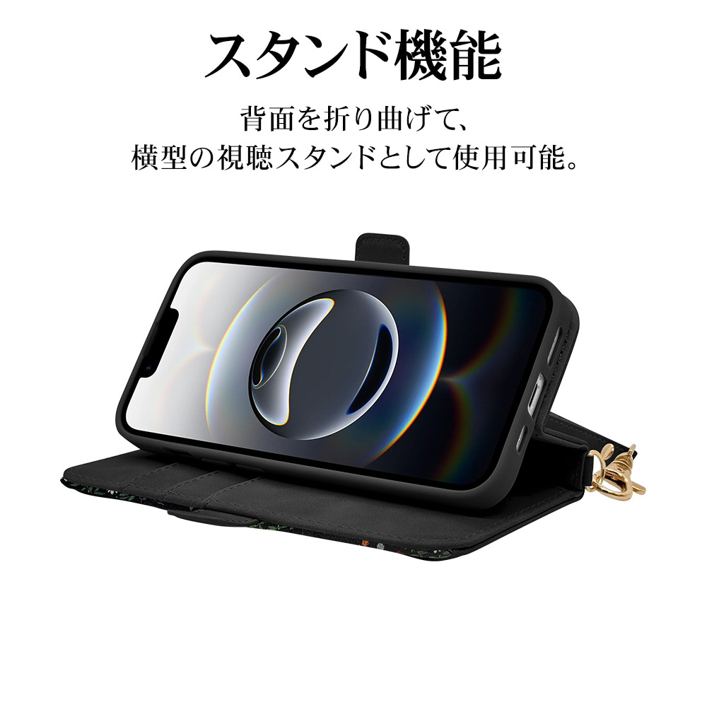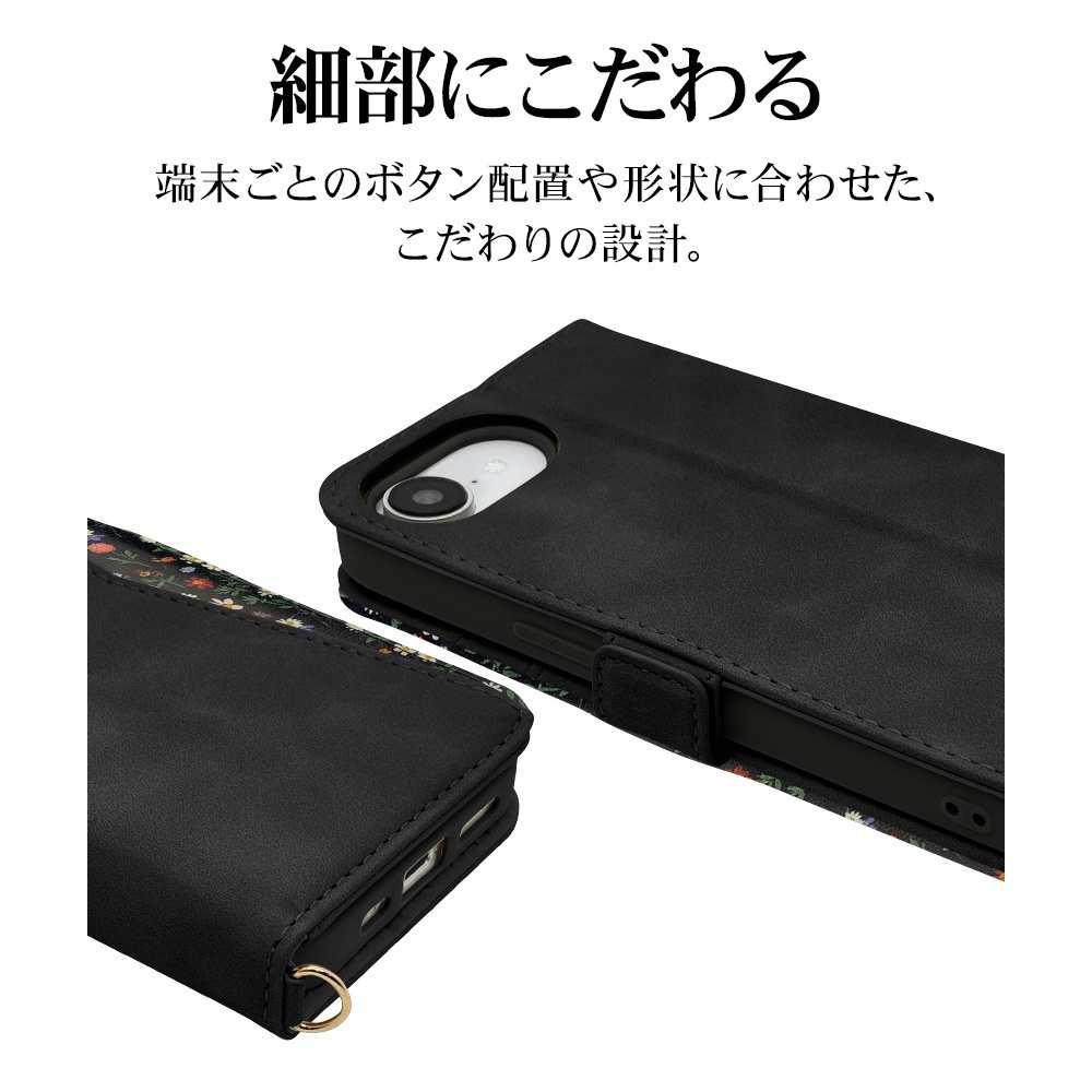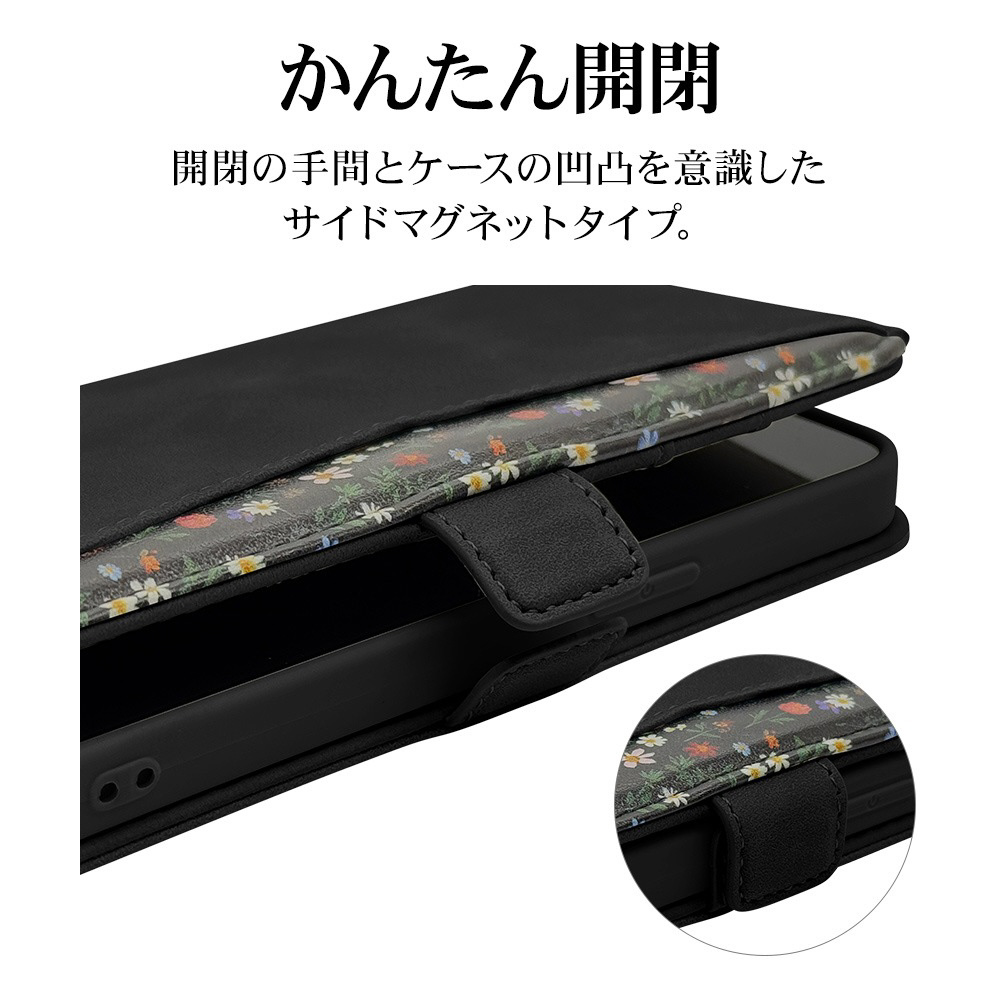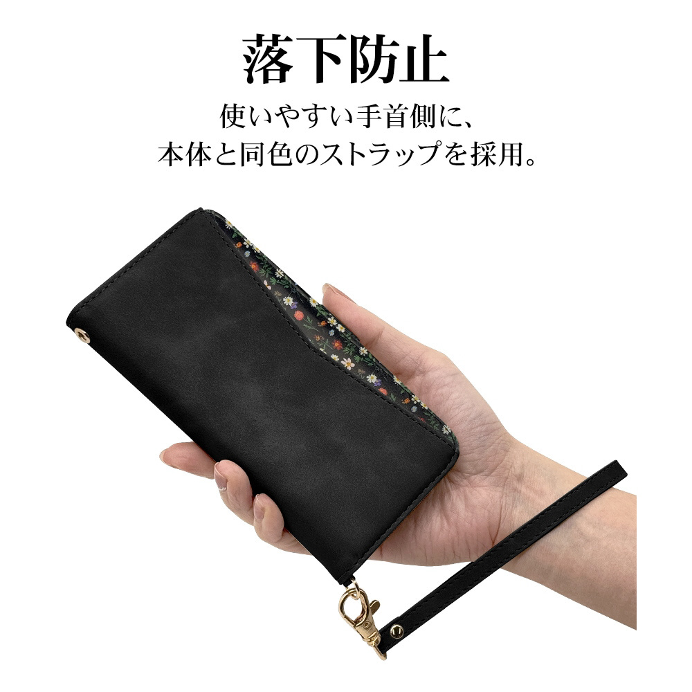液晶画面側と背面側の両面を保護できる手首まで通せるハンドストラップ付きの花柄手帳ケースです。