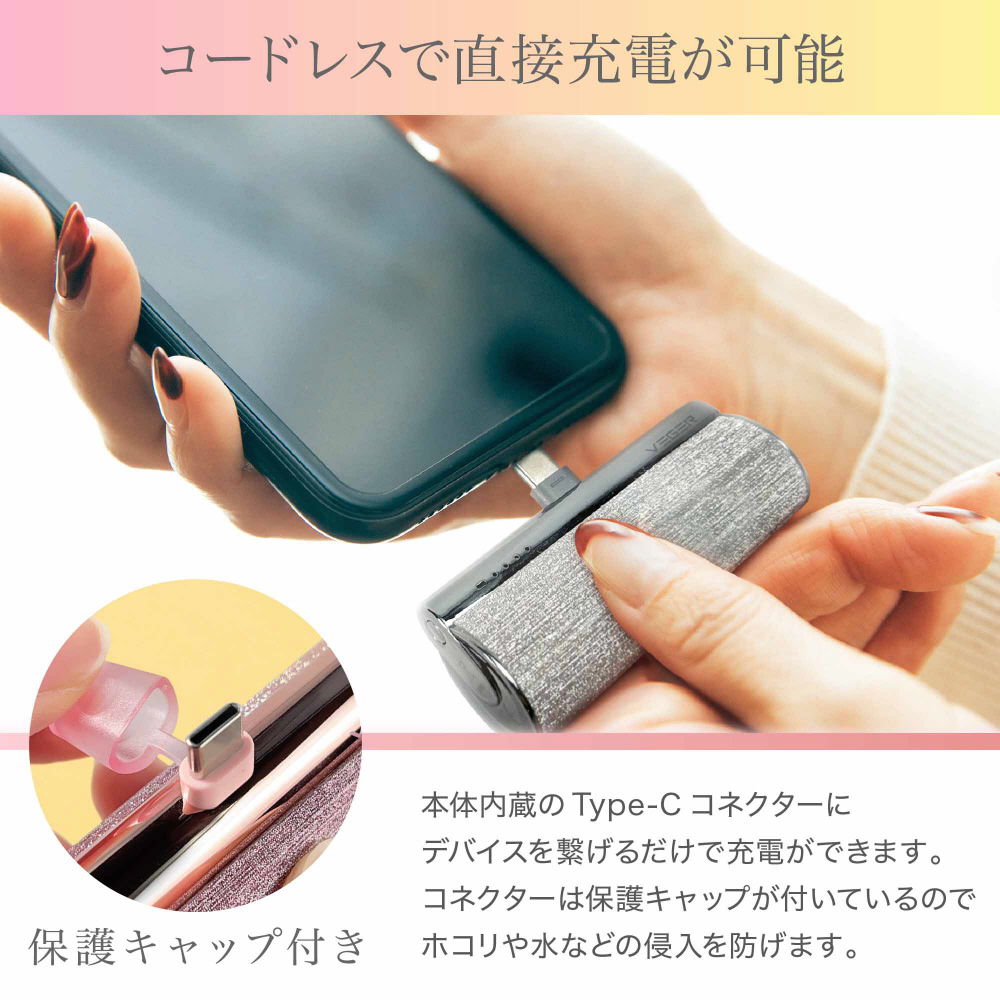 Type-Cコネクターが本体に内蔵されているので、直接デバイスを繋げて充電することができます。ケーブルが要らないので小さなバッグの時も安心。コードレスでコンパクトに持ち歩くことができます。