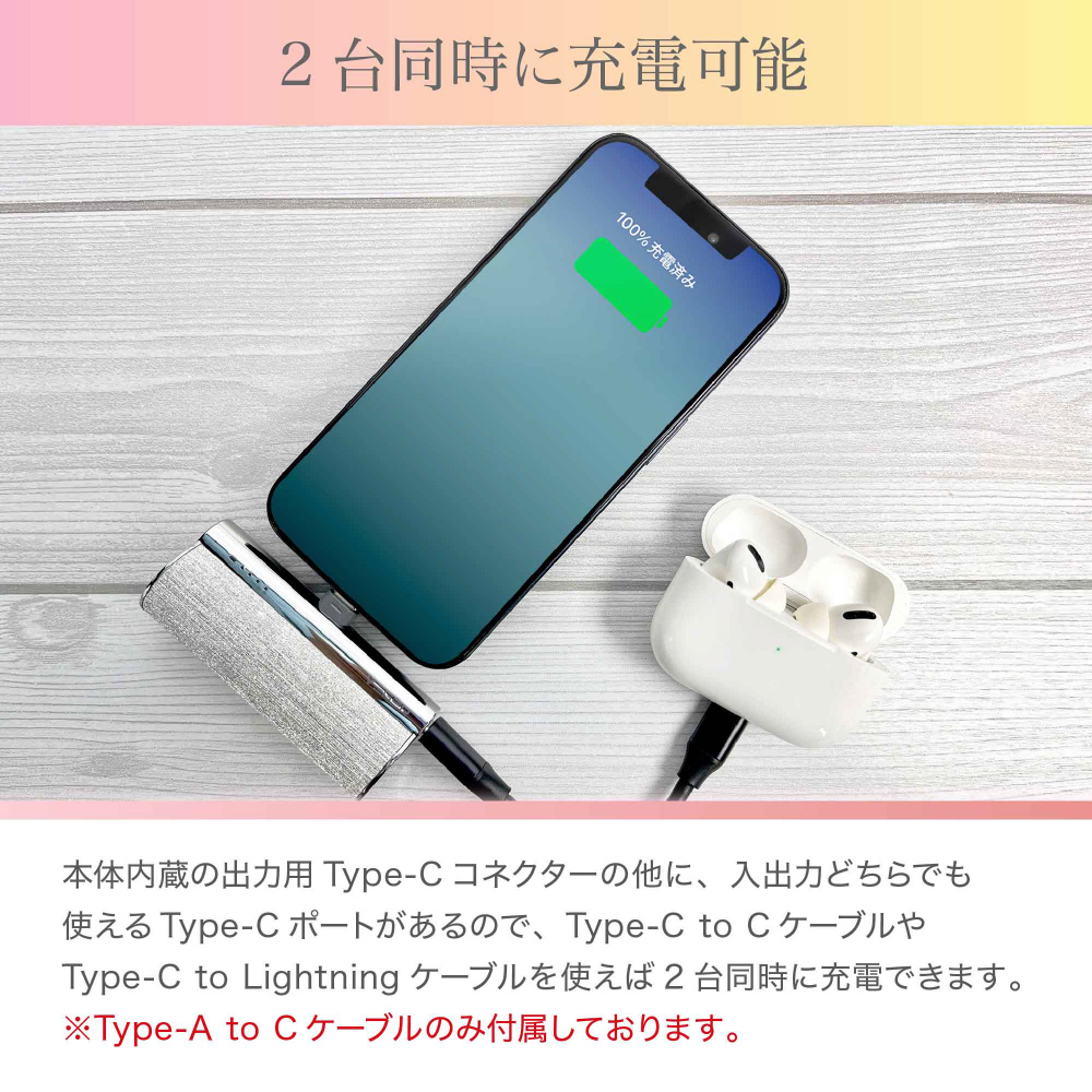 本体内蔵の出力用Type-Cコネクターの他に入力・出力どちらでも使えるType-Cポートがあるので、Type-C to CケーブルやType-C to Lightningケーブルを使うことで2台同時に充電することができます。※Type-A to Cケーブルのみ付属しております。