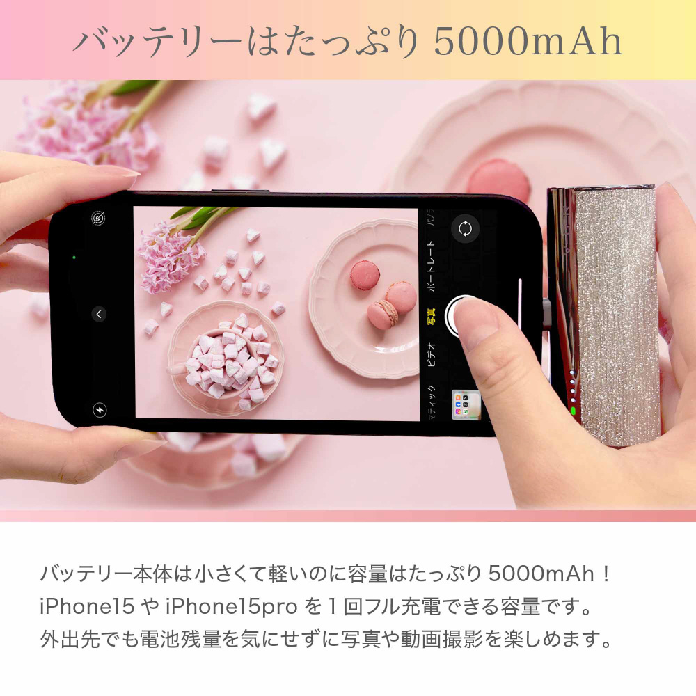 バッテリー容量は5000mAhと小型なのに大容量。Type-Cコネクターが本体に内蔵されているので、ケーブルを持ち歩く必要がありません。