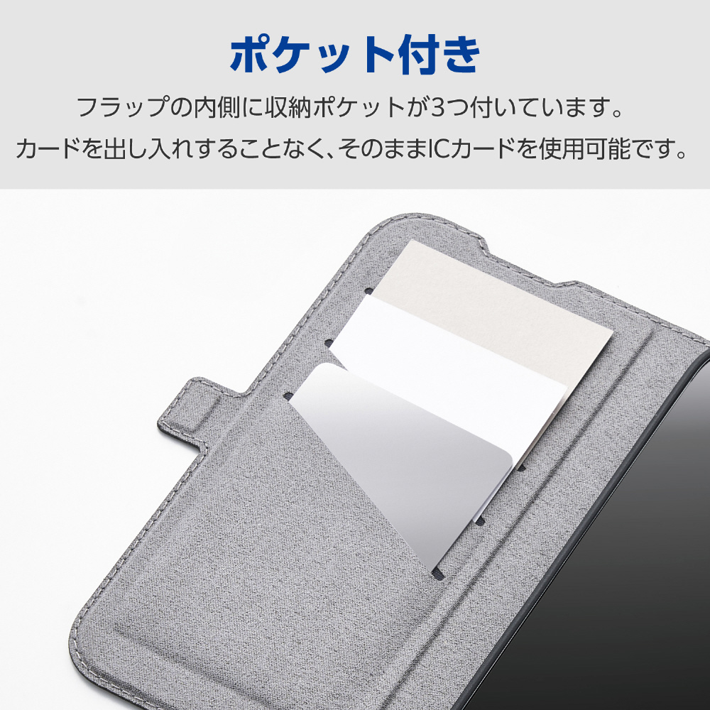 ■フラップの内側に、メモやカードなどが収納できるポケットが3つ付いています。カードを出し入れすることなく、そのままICカードを使用可能です。