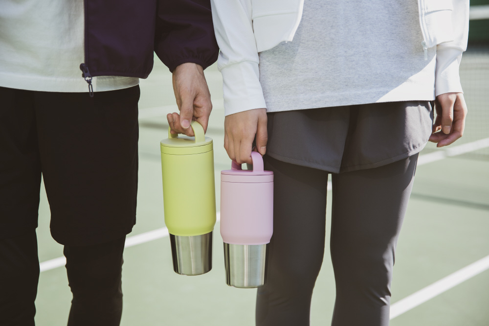 段差のある形状で大容量でも持ちやすく、自動車のドリンクホルダーなどにも入れやすい。