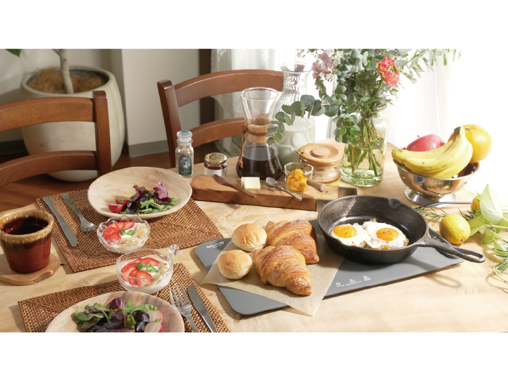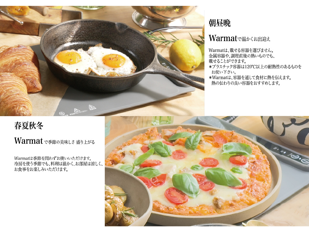 Warmatは、紙・金属・陶器、色々な素材のお皿やお鍋にお使いいただけます(耐熱温度120℃以上のものに限ります)。Warmatとの接地面積が広い、底が平らでWarmatとの間に空間ができない食器やシート等を活用すると、