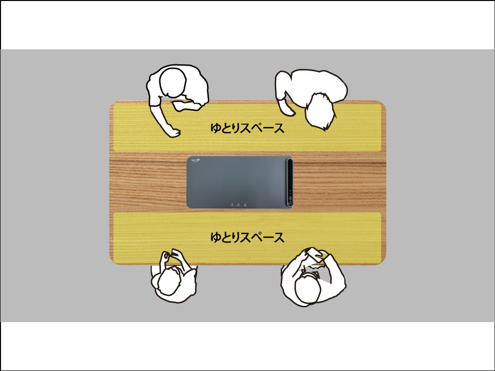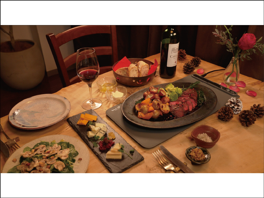 一般的なダイニングテーブル(120cm×70cmを想定)にベストマッチするサイズ。46.4cm×24cmのWarmatは、大皿1枚、中皿1枚がちょうどよく収まるベストサイズ。ダイニングの真ん中で主役の大皿やお鍋を置いても、他の食器やお皿を邪魔せず保温。一人でも、家族みんなの分を揃えても、ダイニングのスペースを確保しながら使用できます。