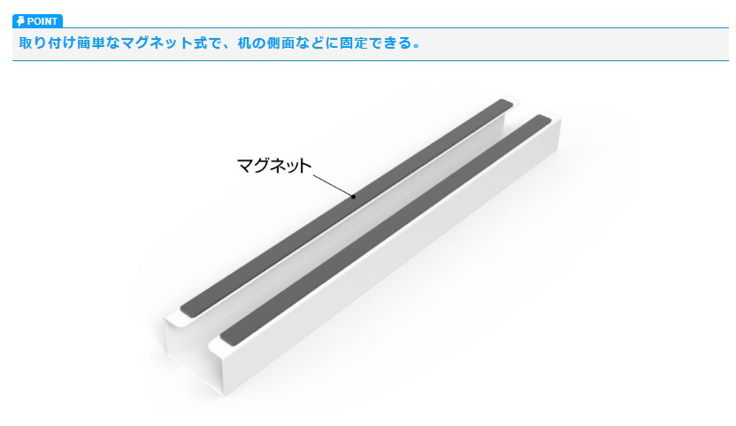 ■取り付け簡単なマグネット式で、机の側面などに固定できる。