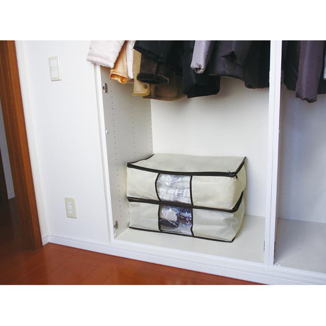 圧縮した衣類を、専用ケース入れて収納できます。クローゼットやベット下などスッキリ収納可能です。