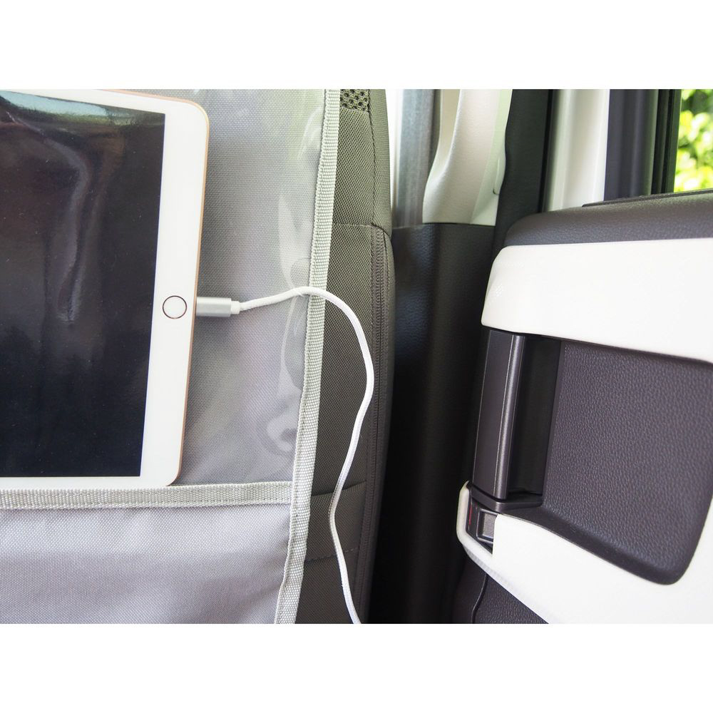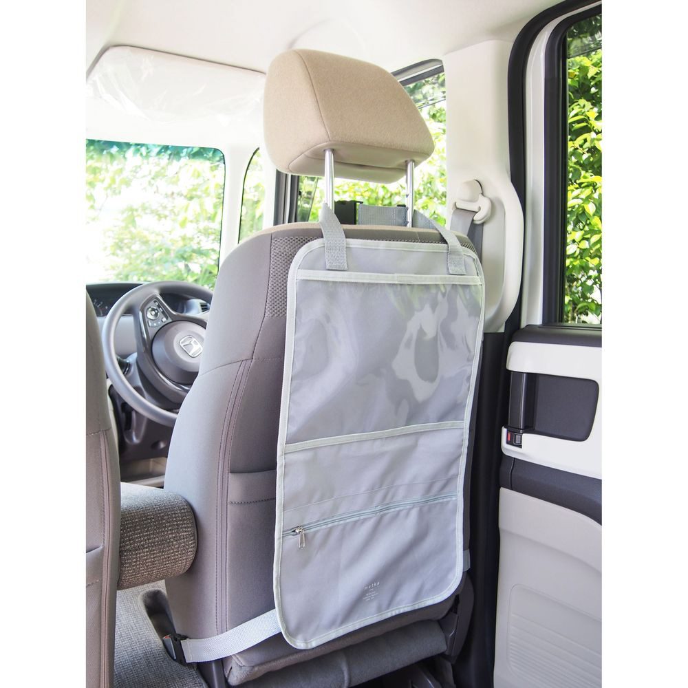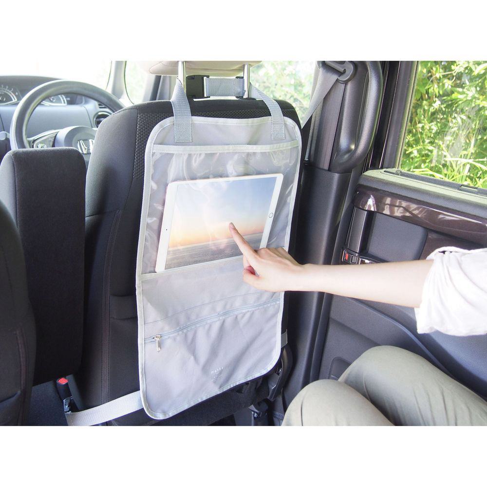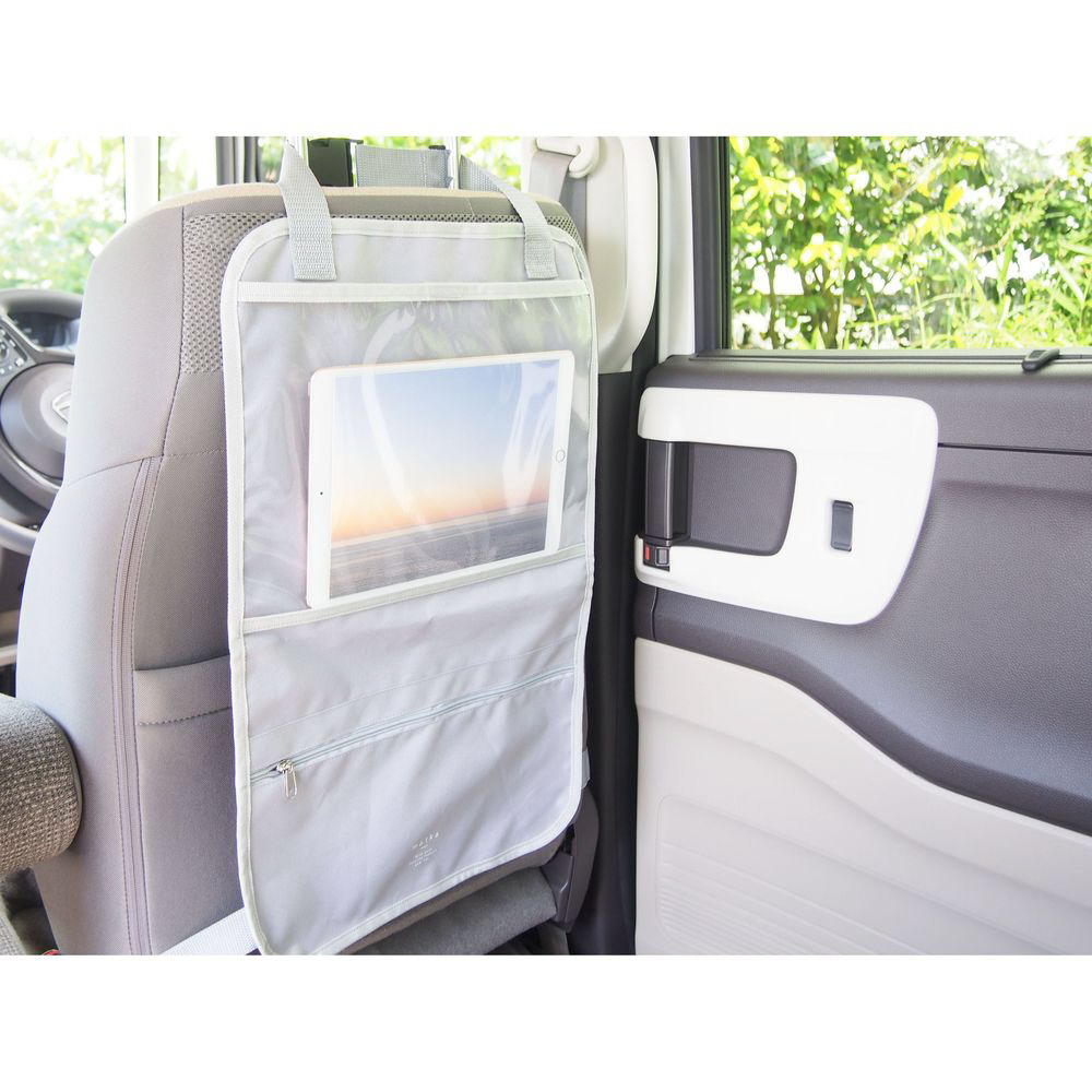 ナチュラルカラーと北欧風デザインがおしゃれなカー用品シリーズです。車内の居心地がもっと良くなる、便利で素敵なアイテムを揃えました。座席のヘッドレストに設置するだけで後部座席での動画鑑賞や小物の収納ができるためとっても便利なシートバックポケットです。座席の後ろをしっかりガードできるサイズはお子様の蹴り上げなどによるシート汚れを防止します。さらに、中に物を入れたまま2つに折畳んで持ち運べるため、ちょっとしたお出かけやアウトドアの際に大活躍します。タブレットを入れられるポケットの両端には充電コードを通せる穴付き。表面は撥水加工なので汚れが拭き取りやすくなっています。【仕様】耐荷重:1kg(吊った状態)●透明ポケット:横27×縦17×厚み1cmまでのタブレットが入ります