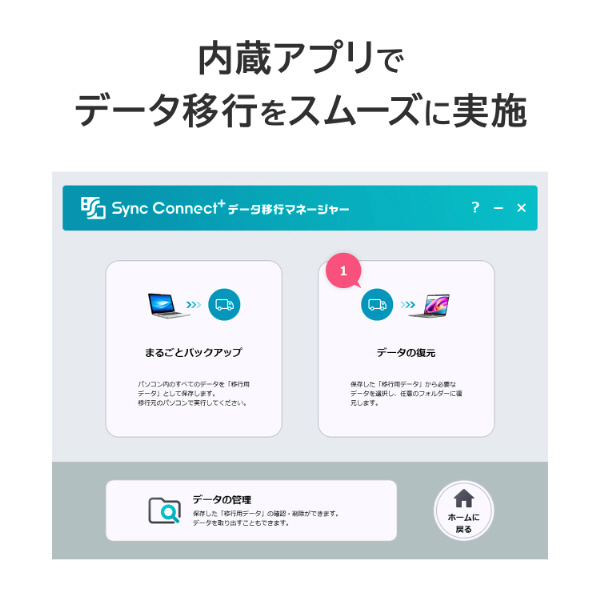 データ移行アプリ「Sync Connect+ データ移行マネージャー」が内蔵されています。