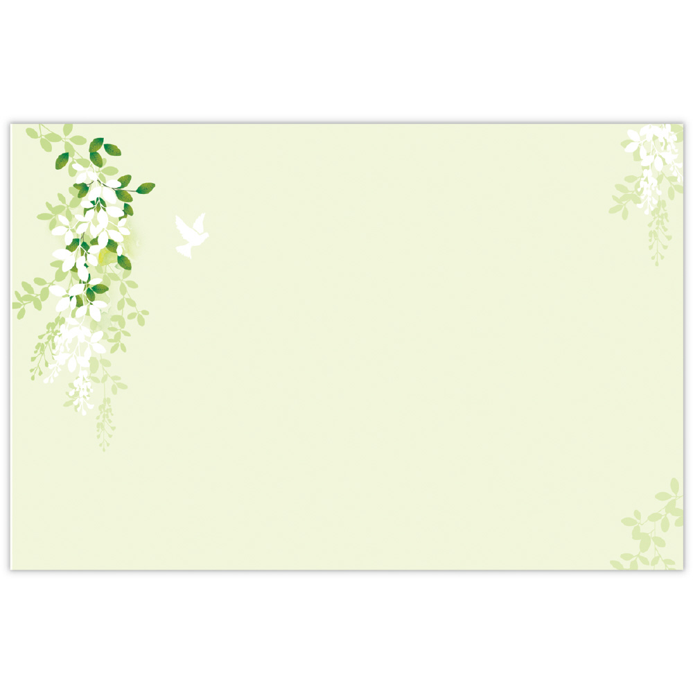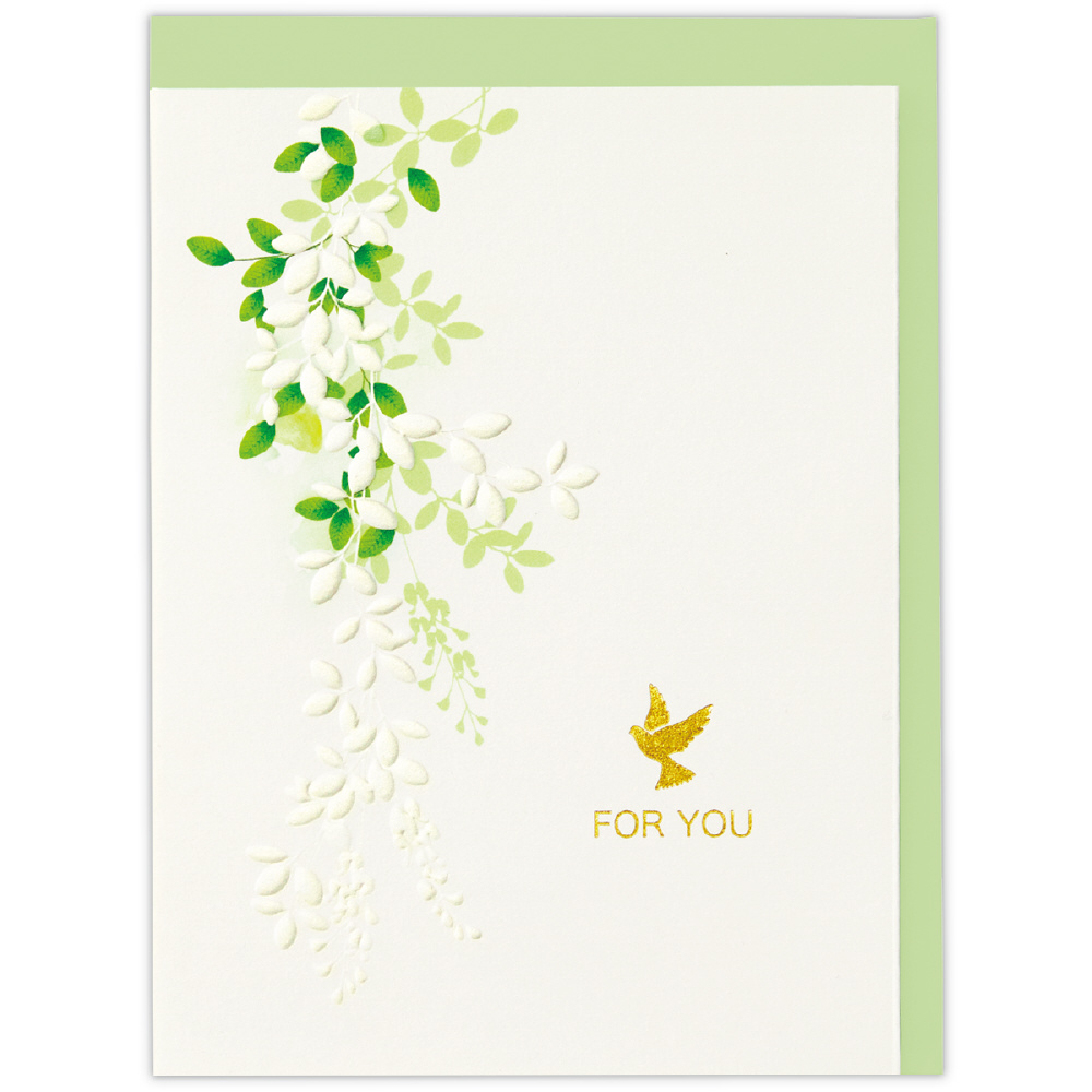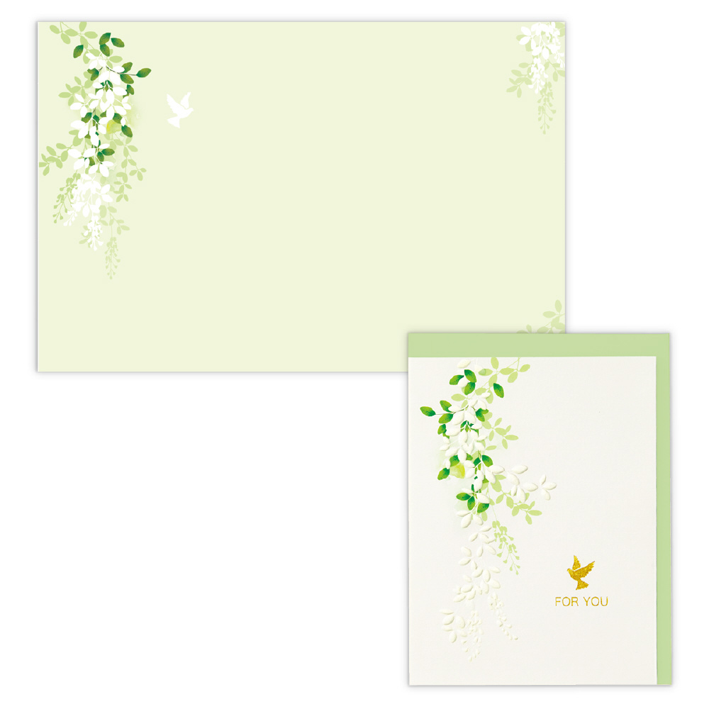 レターアイテムの中から人気の柄やロングセラーの柄をカードに落とし込みました。後ろから日の光を受けて輝く葉っぱの様子を繊細に描きました。パールシルクとエンボス加工を施したこだわりの仕様です。