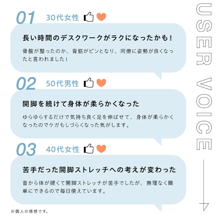 開脚チェアに座ってゆらゆら360°揺らすと自重で簡単に開脚ストレッチができます。