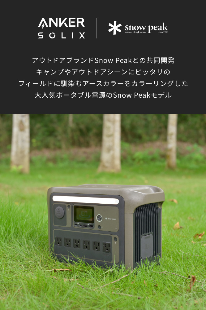 AnkerとアウトドアブランドSnow Peakとの共同開発。キャンプやアウトドアシーンにピッタリのフィールドに馴染むアースカラーをカラーリングした大人気ポータブル電源のSnow Peakモデルが登場。