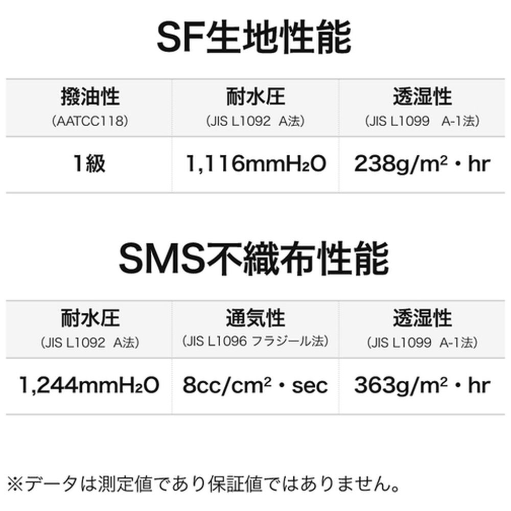 ■撥油性に優れるSF生地と耐水圧+通気性を有するSMS不織布を使用しています。