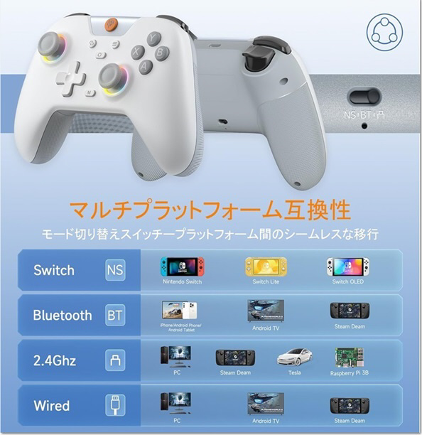 Switchコントローラー、ゲーミングコントローラー、7色ライト、5つのライトモード、5段階振動機能、ホールジョイスティック、ホールトリガー、750mAh大容量バッテリー搭載、PC/Switch/モバイル対応