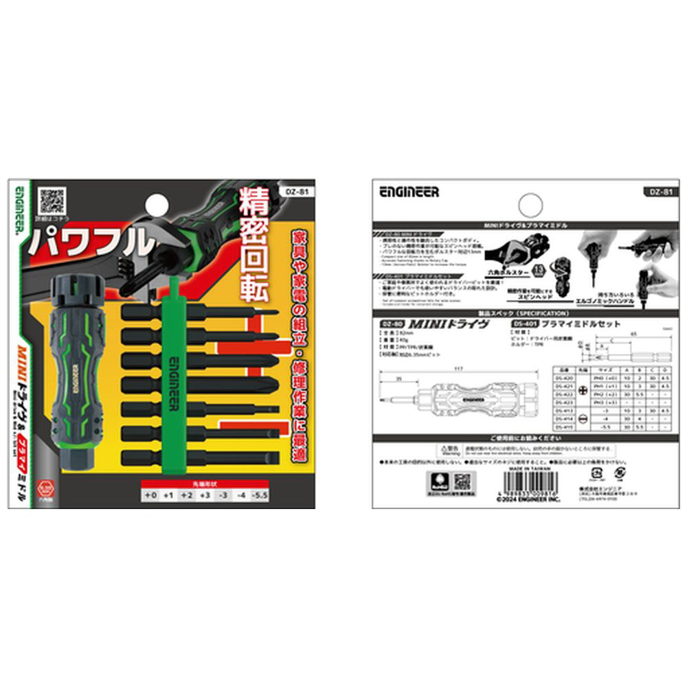 MINIドライヴ(DZ-80)と家具や家電の組み立て、修理に便利なプラス、マイナスビット7本組(DS-401)のセットです。